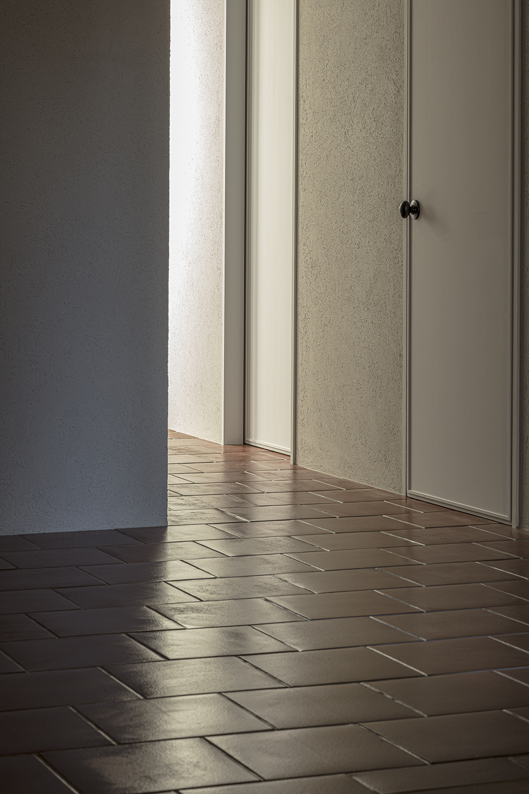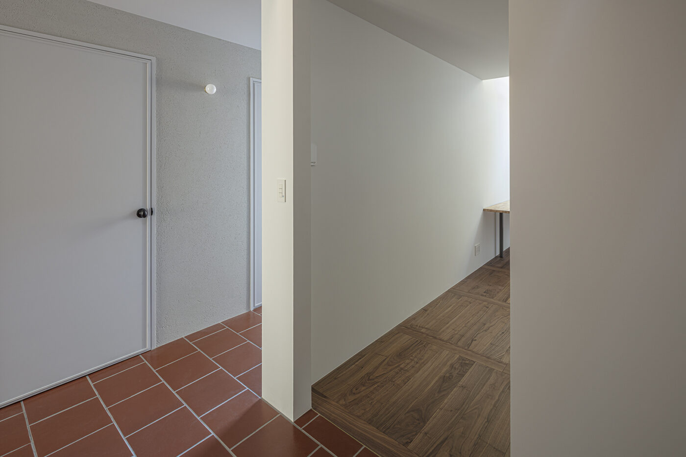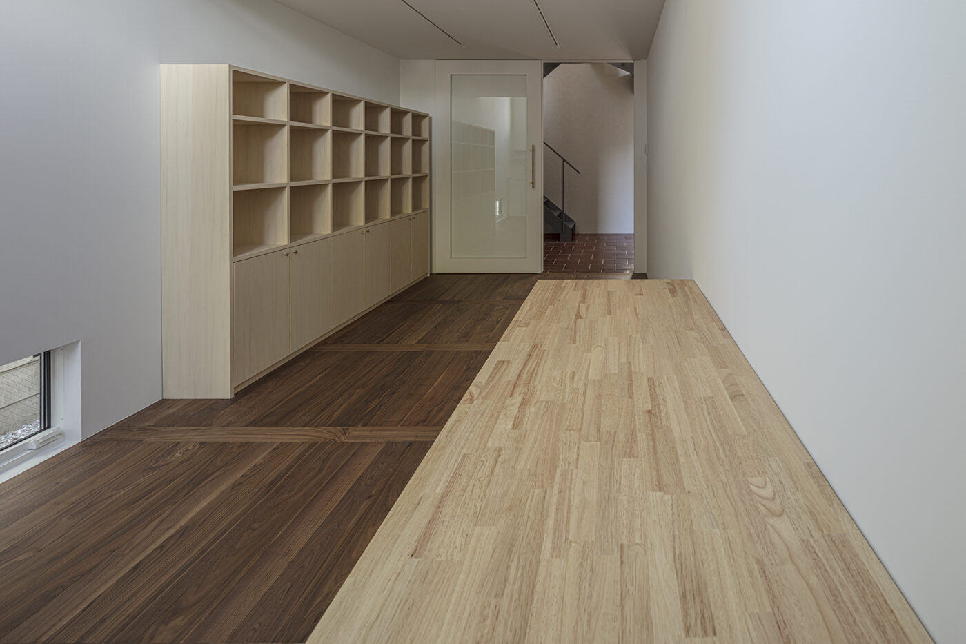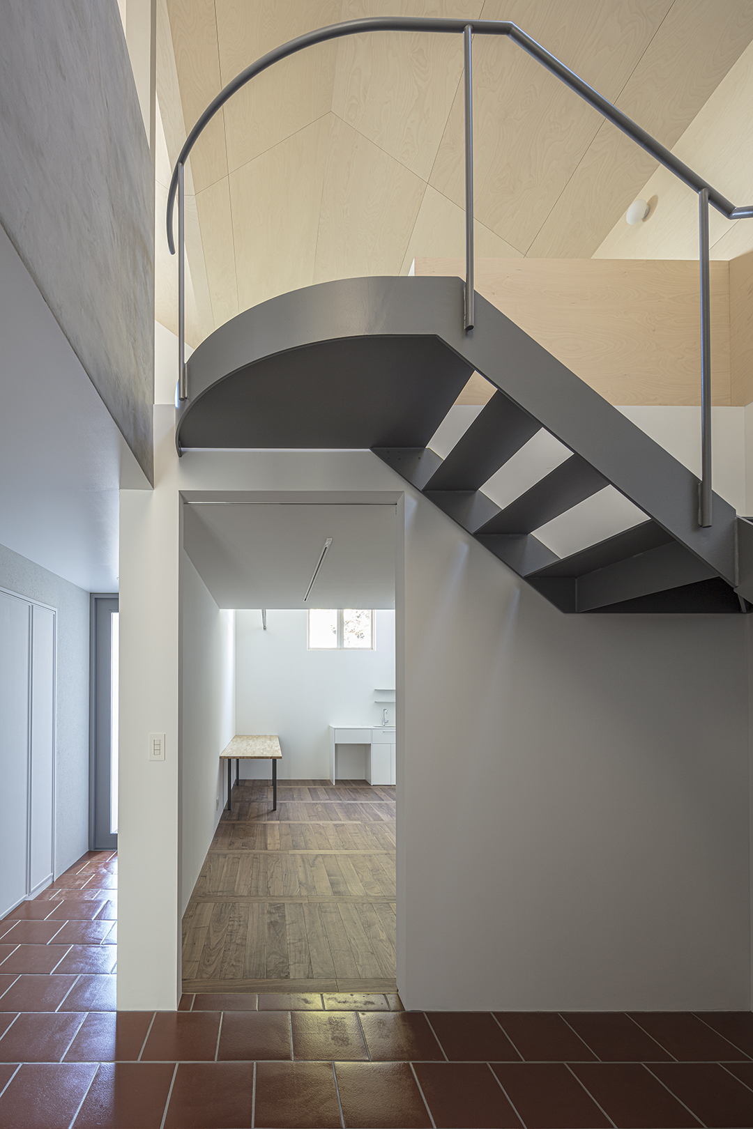 仕事上の来客があるため、1階のエントランス及び動線空間は路地のように感じられる公的なスペースとした。