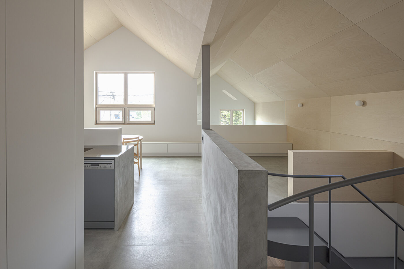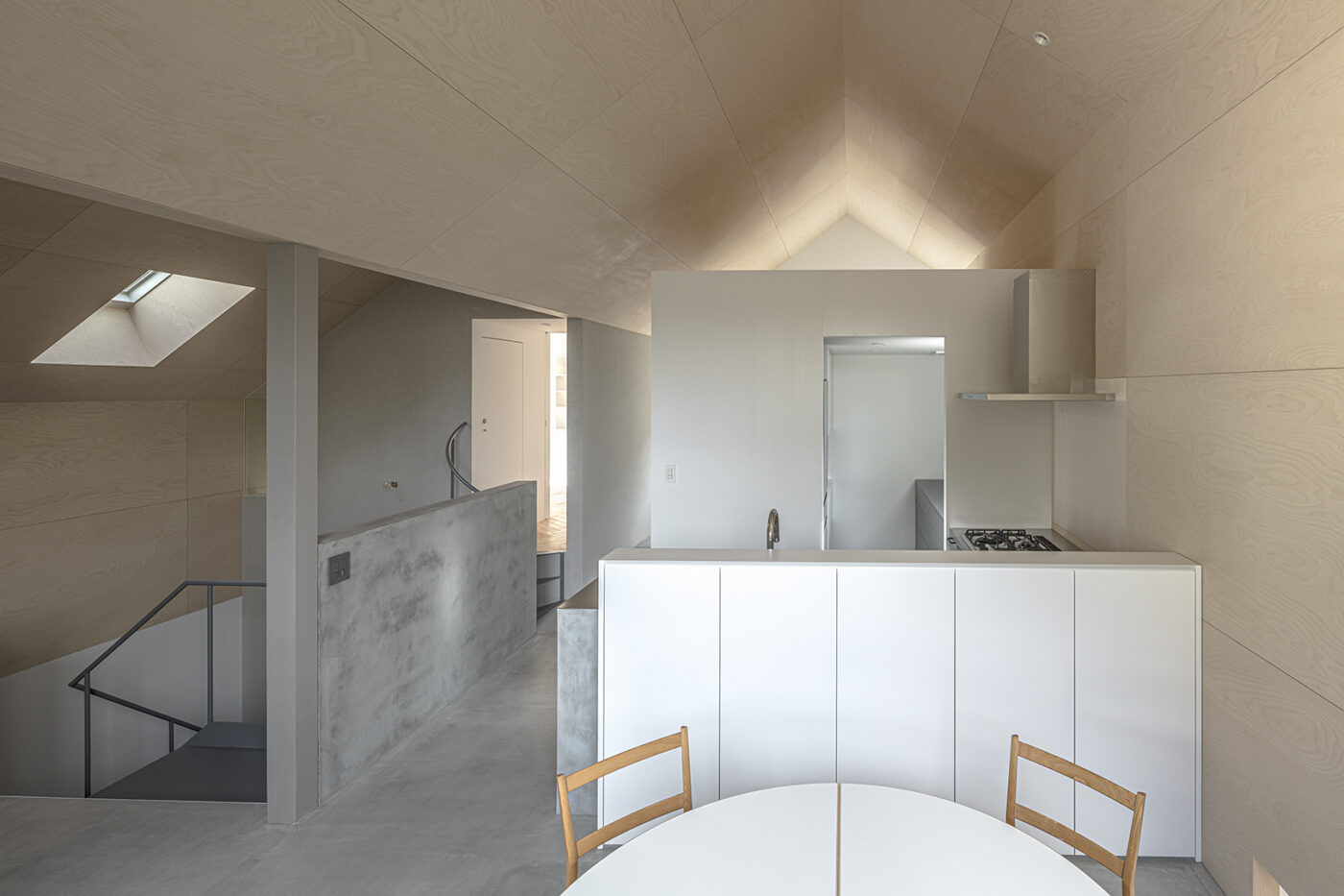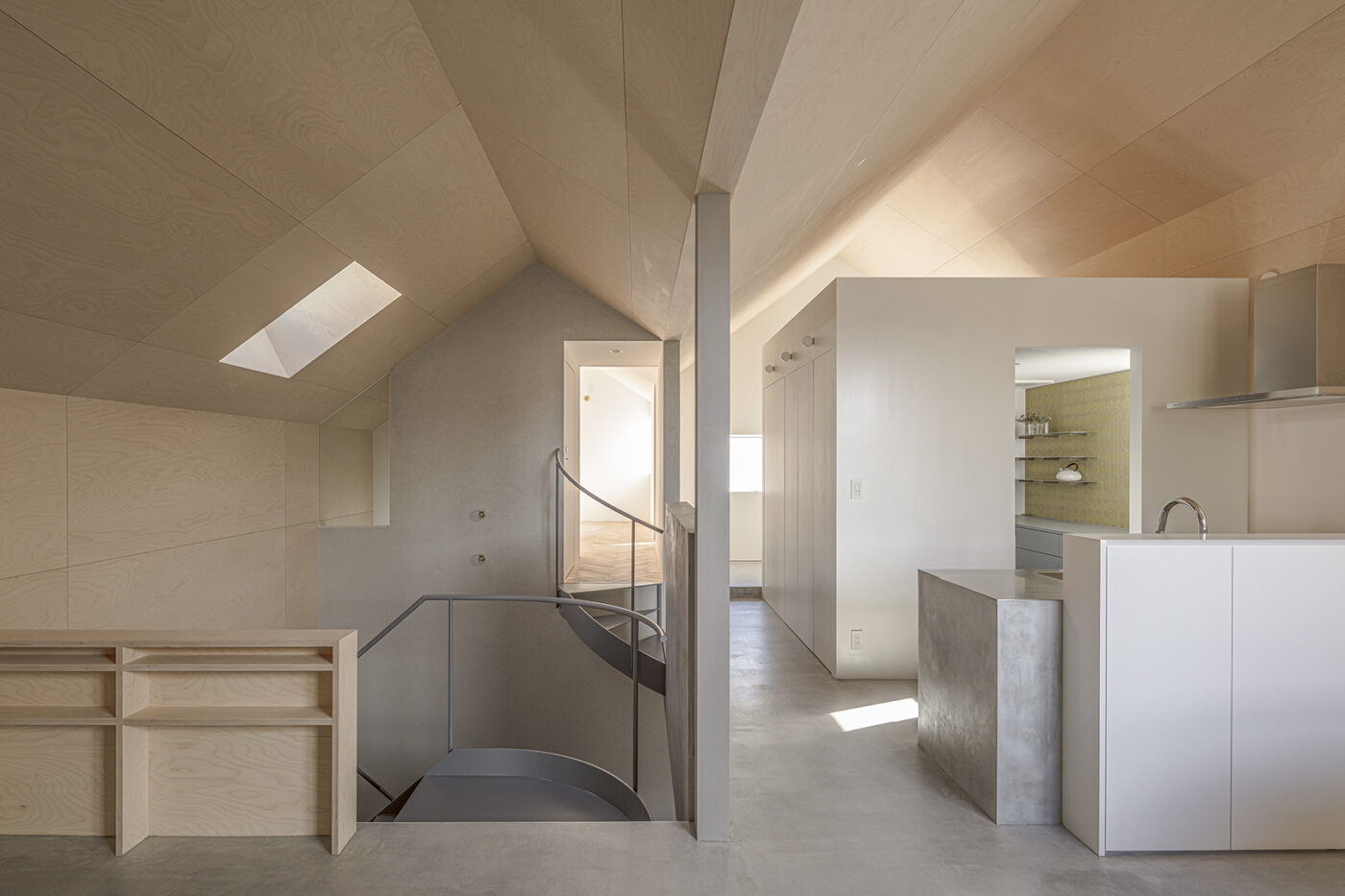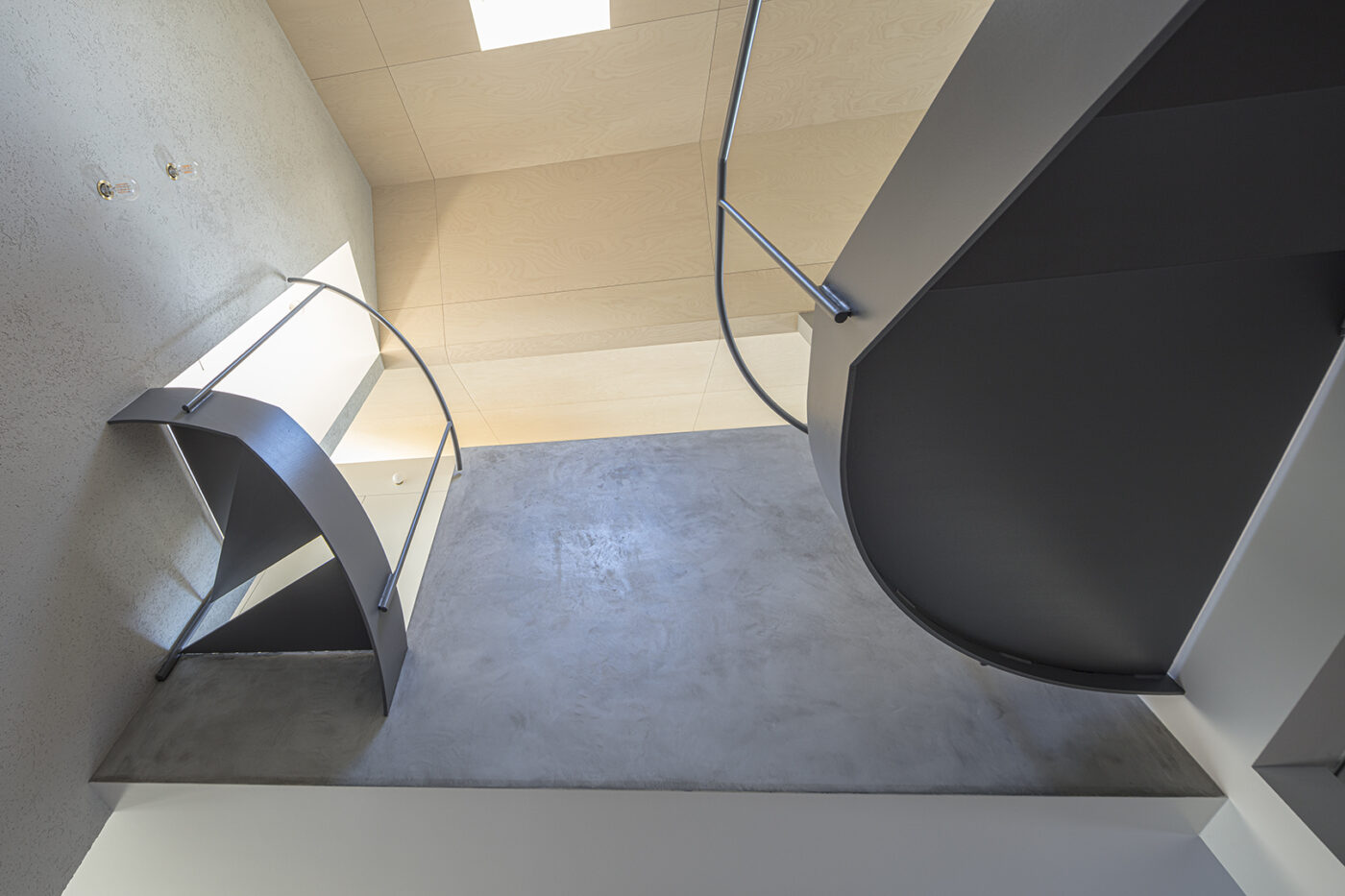 階段室はアトリエの前室であり、トップライトからの光や上階の生活動線が垣間見える余白のような場所でもある。