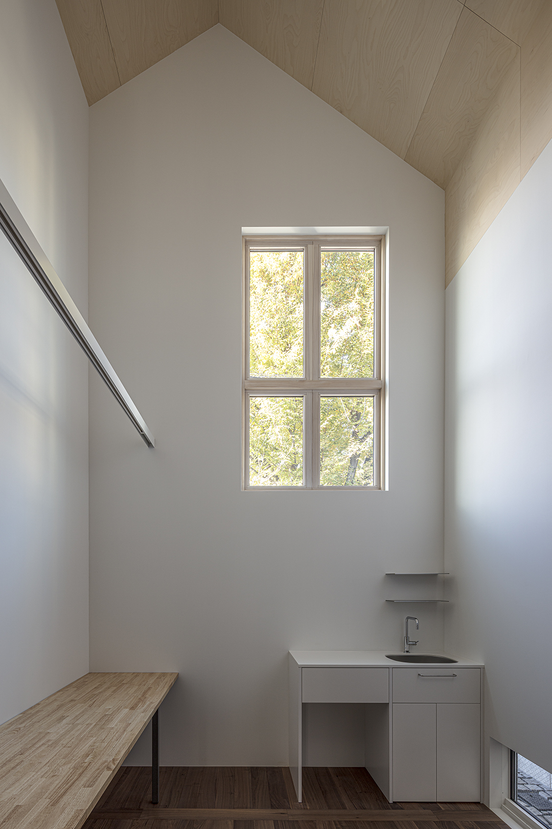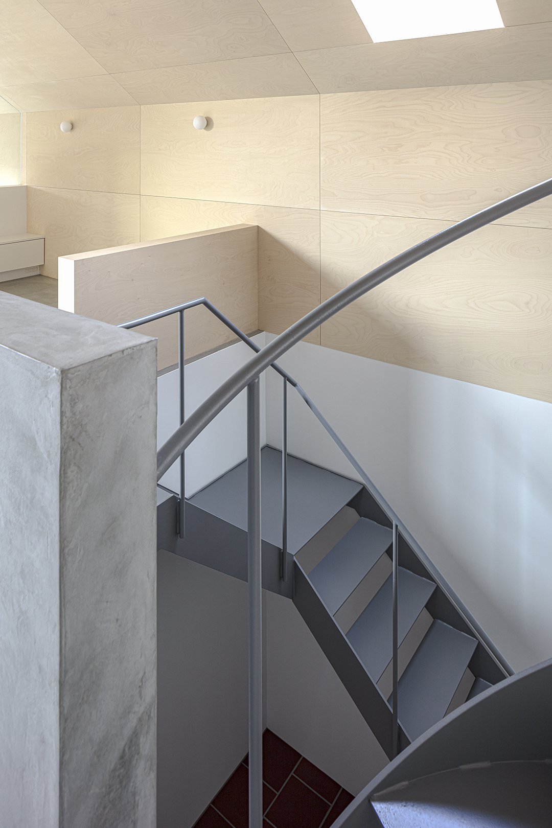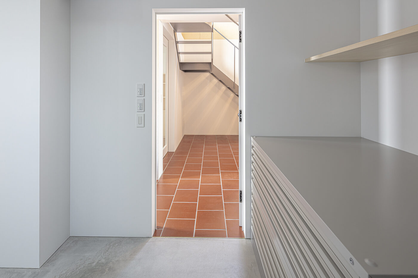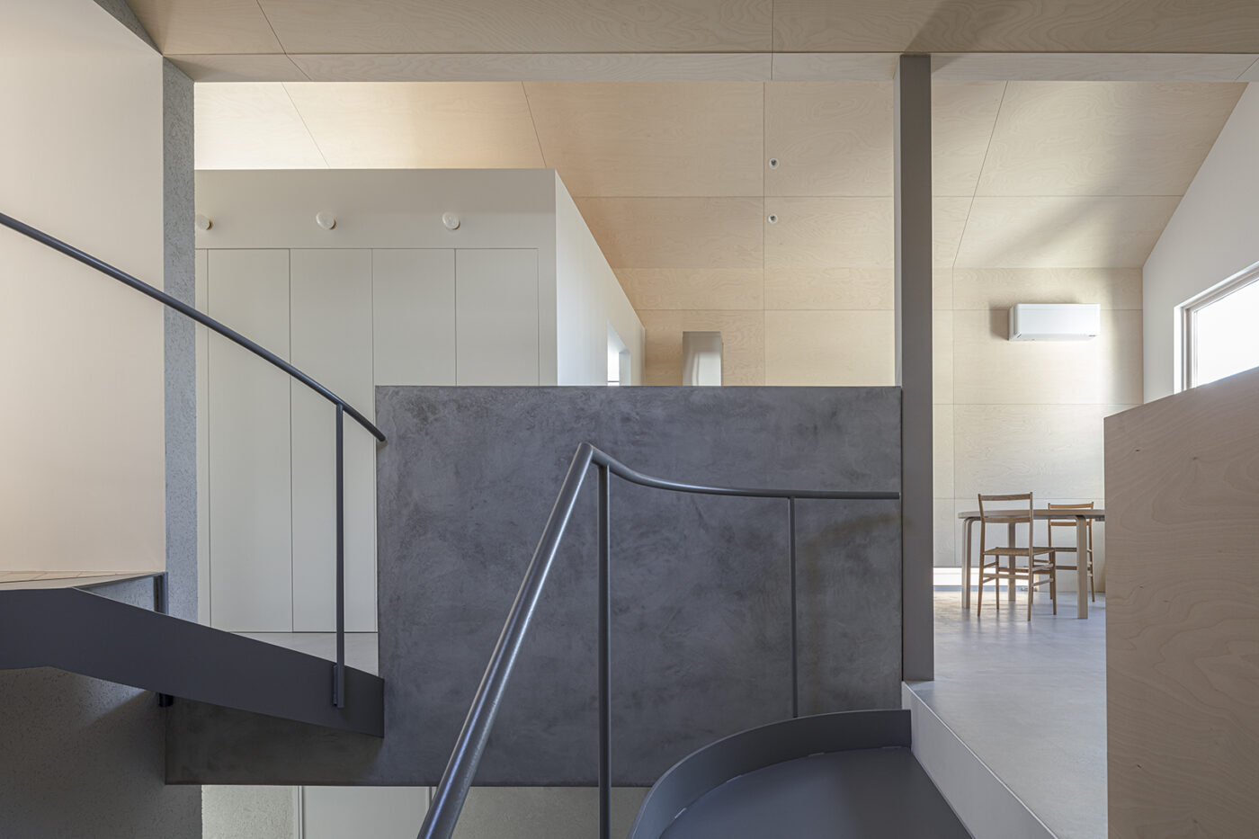 階段室はアトリエの前室であり、トップライトからの光や上階の生活動線が垣間見える余白のような場所でもある。