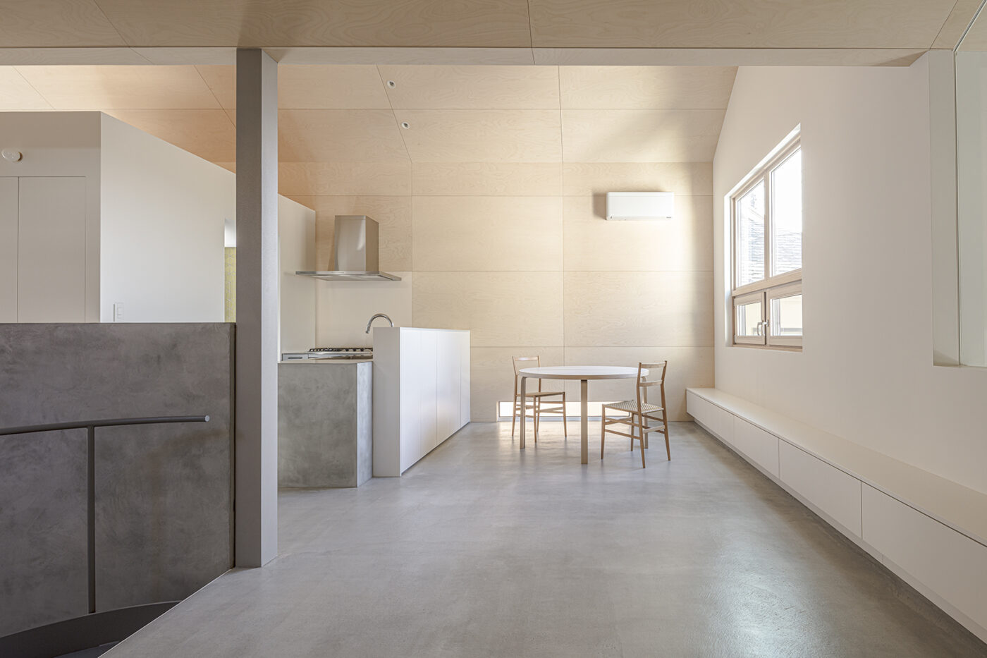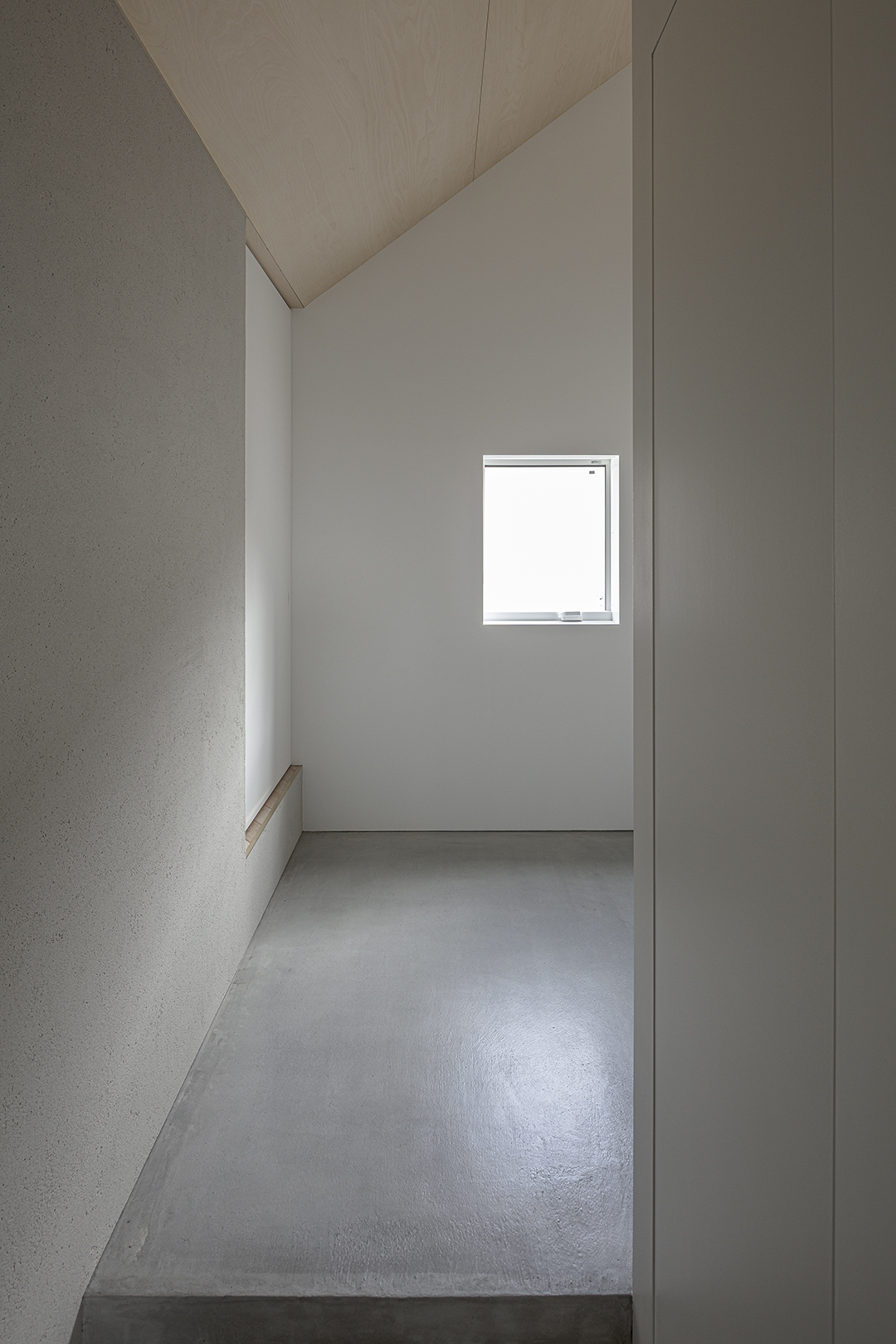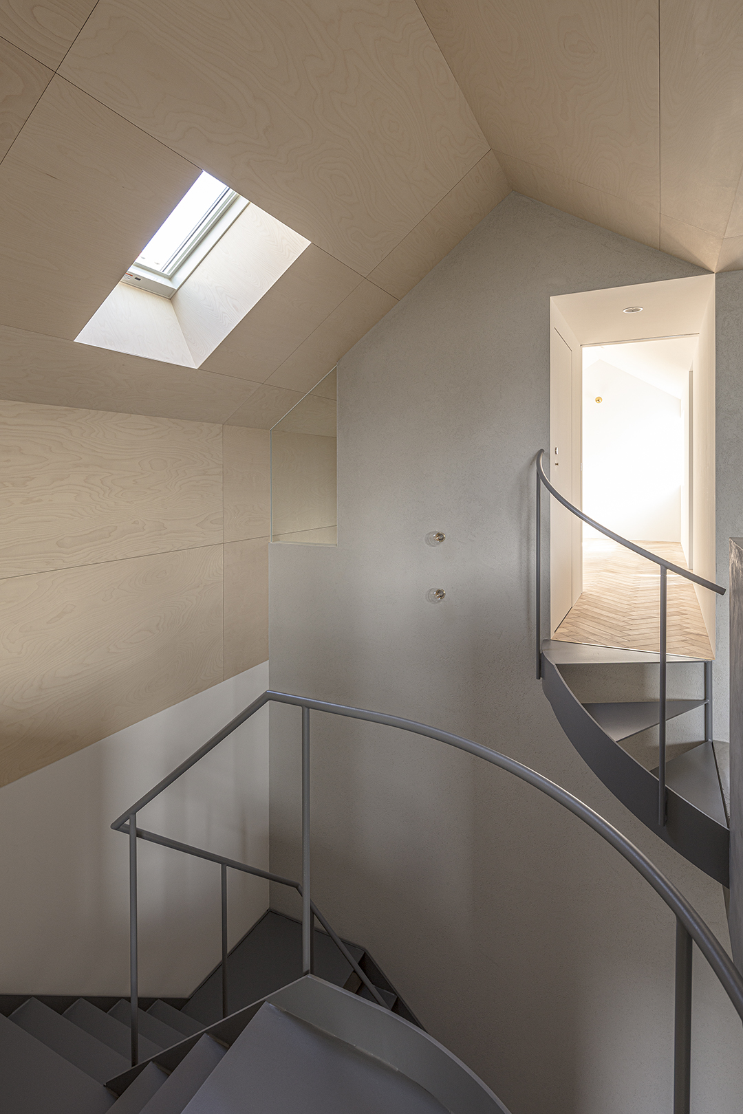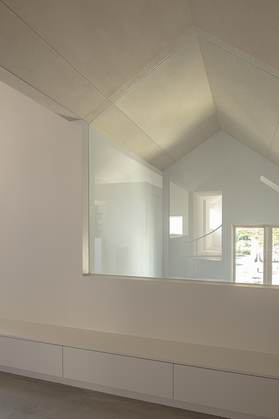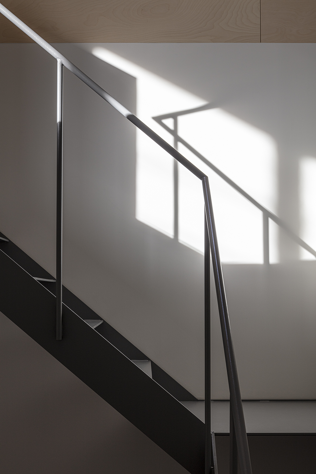 階段室はアトリエの前室であり、トップライトからの光や上階の生活動線が垣間見える余白のような場所でもある。