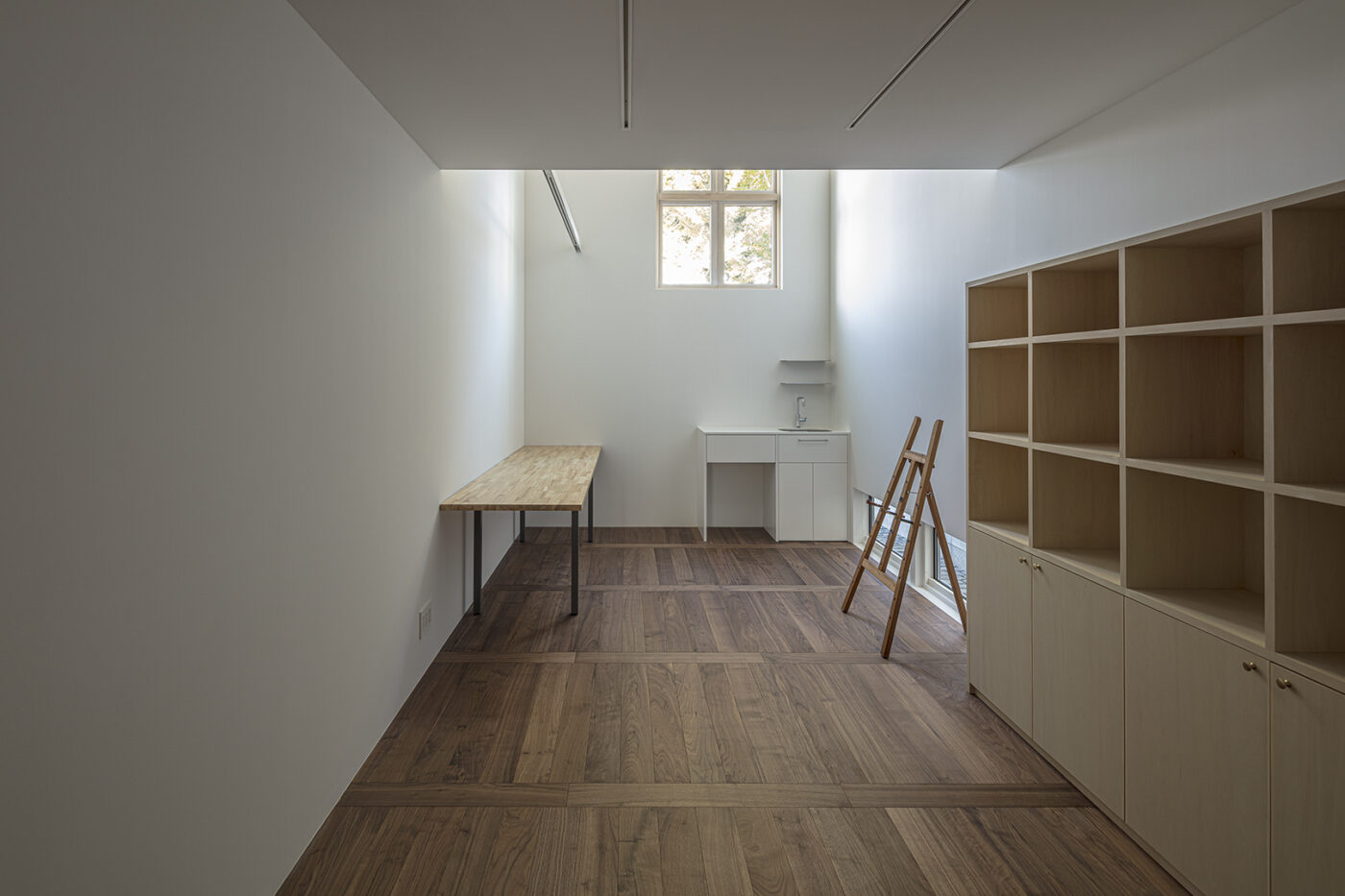 アトリエは2層吹き抜けとし、ケヤキの枝や葉を頭上に感じられる心地よい創作空間とした。