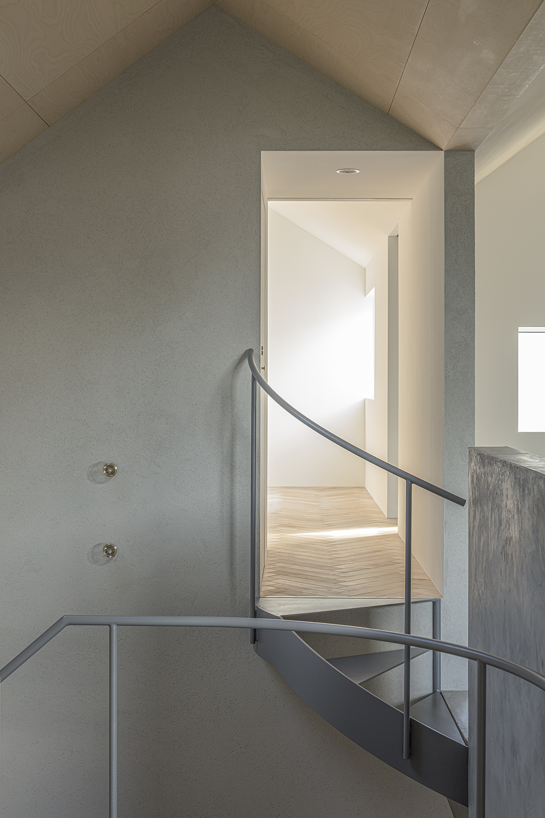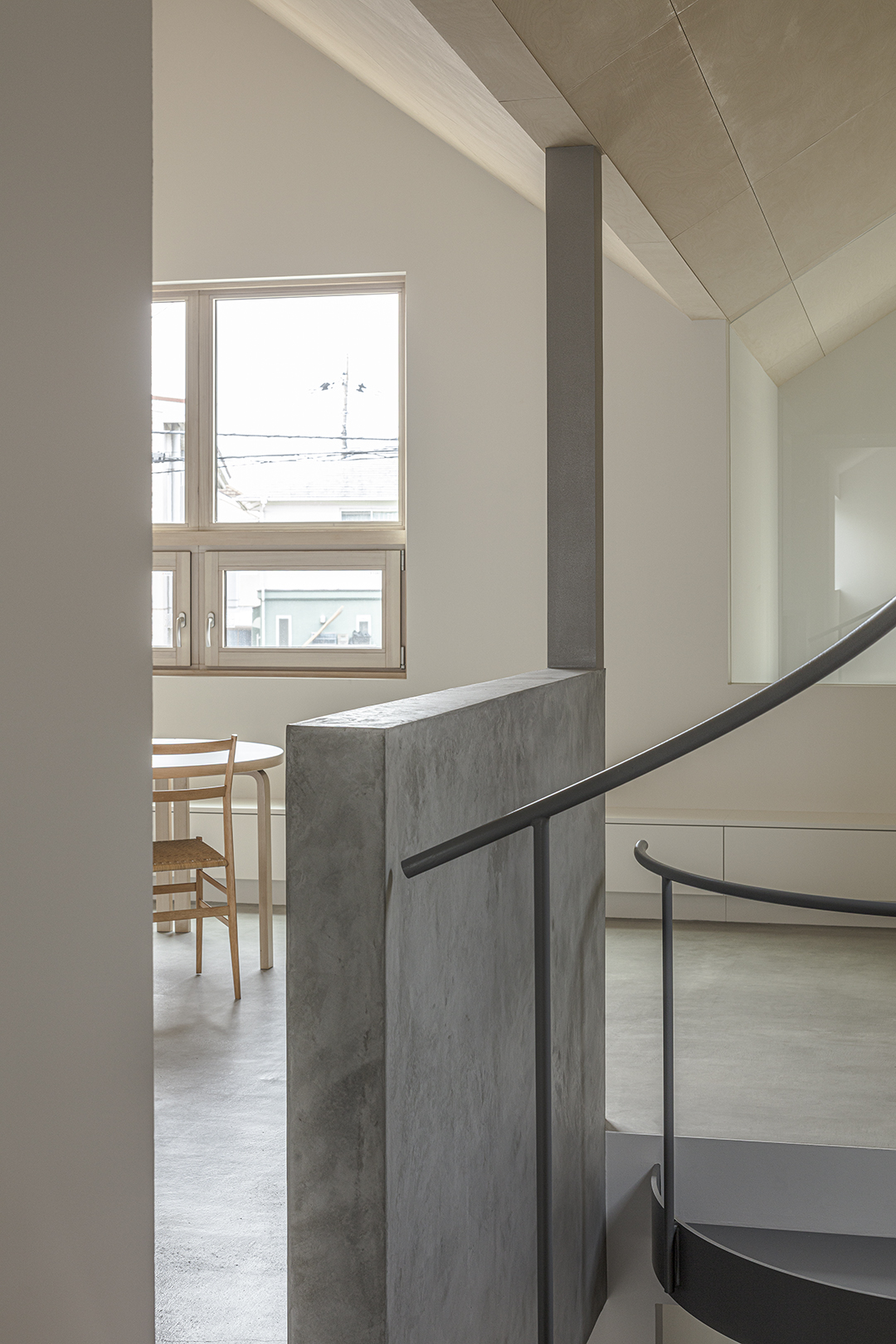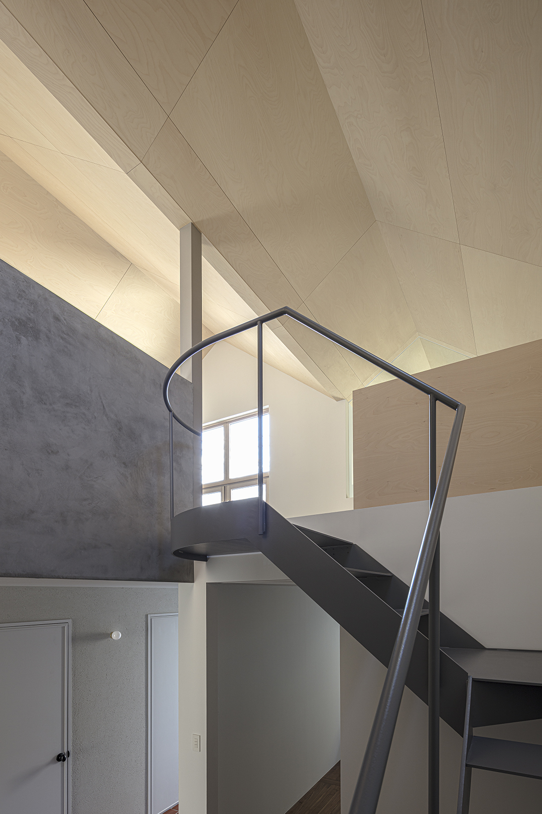 子ども部屋は将来の趣味室的な使い方も想定した。吹き抜けに飛び出た1/4螺旋階段を2段上がることにより距離感が生まれ、離れのような趣のある部屋となった。