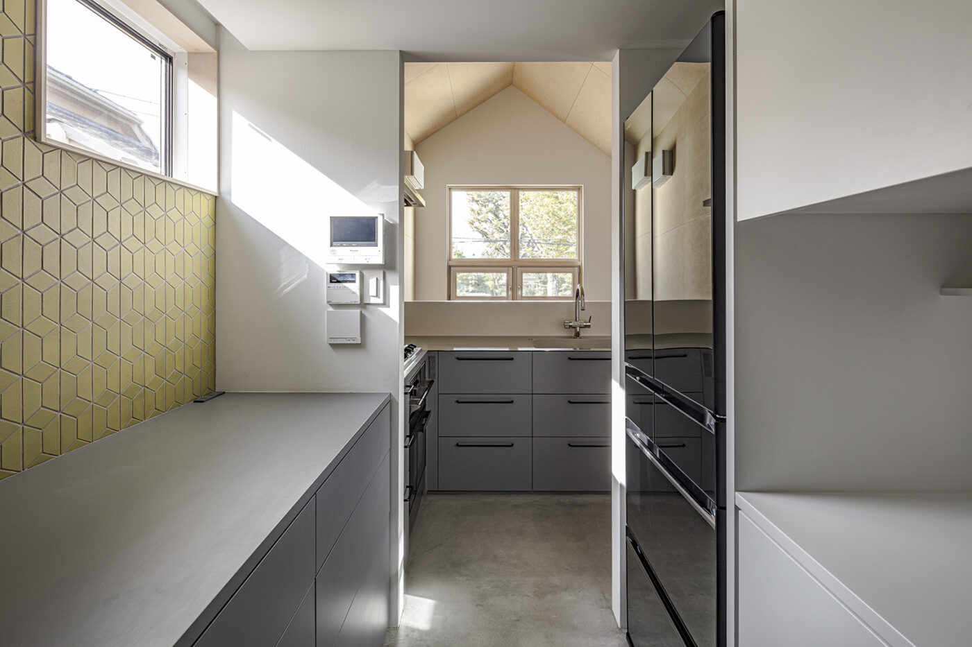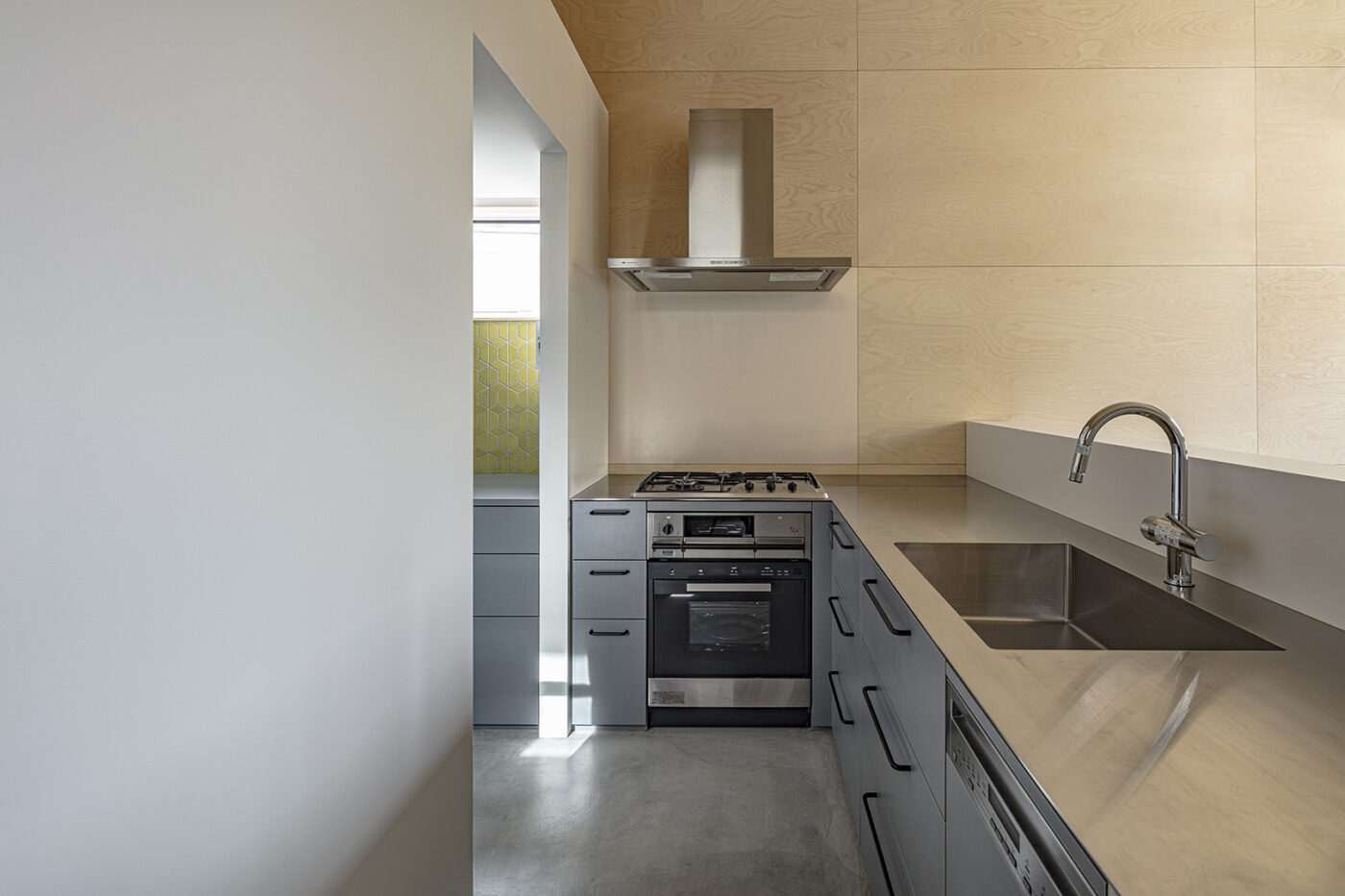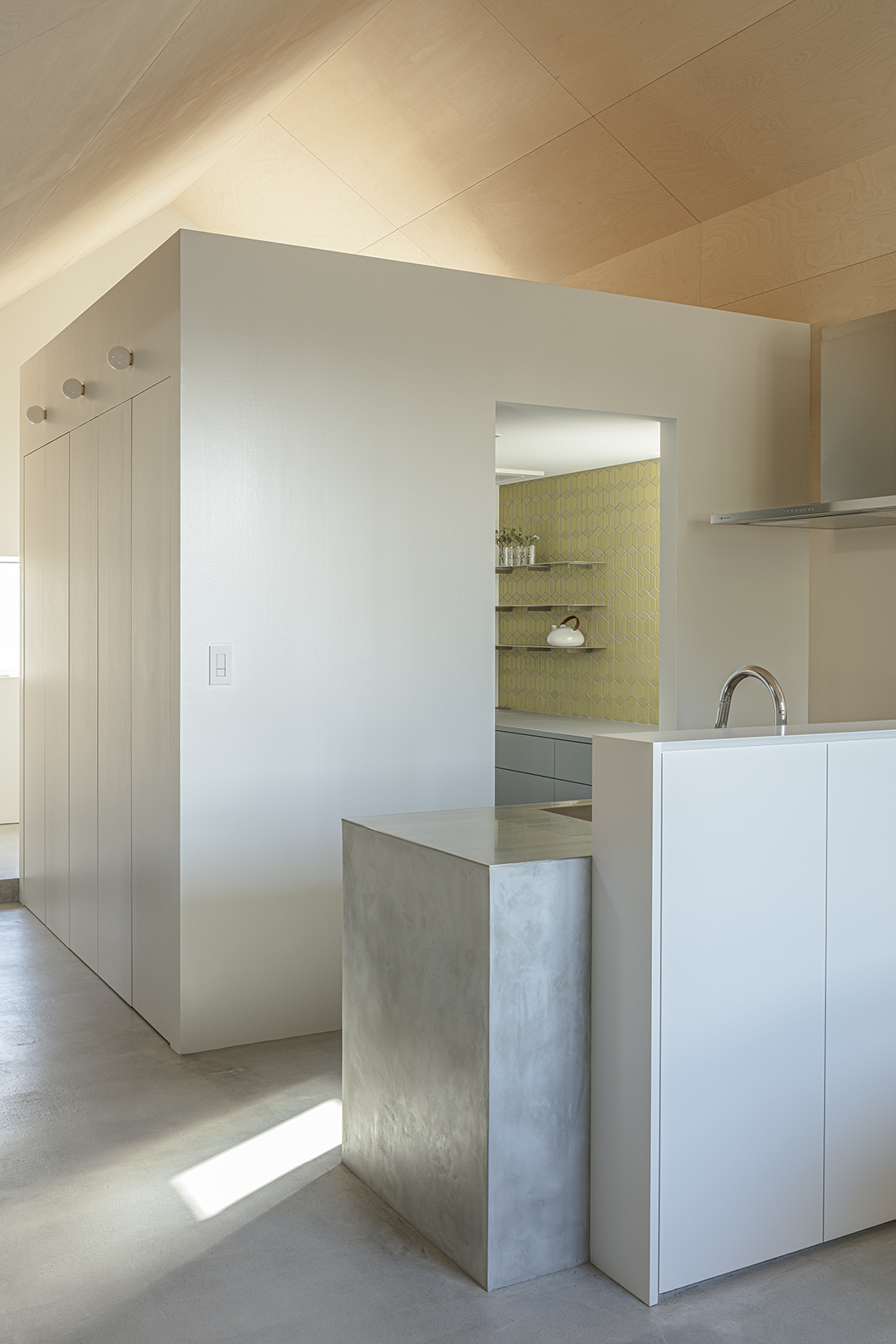 パントリーの壁やトイレ床に、色の楽しい輸入タイルを使っている。そうした仕上げの混在を、バーチ合板によるひとつながりの壁と天井面が包容する。