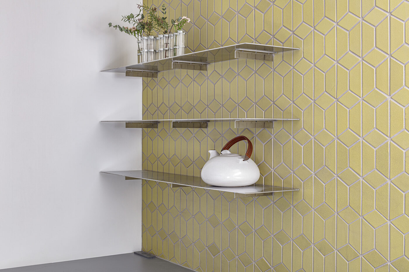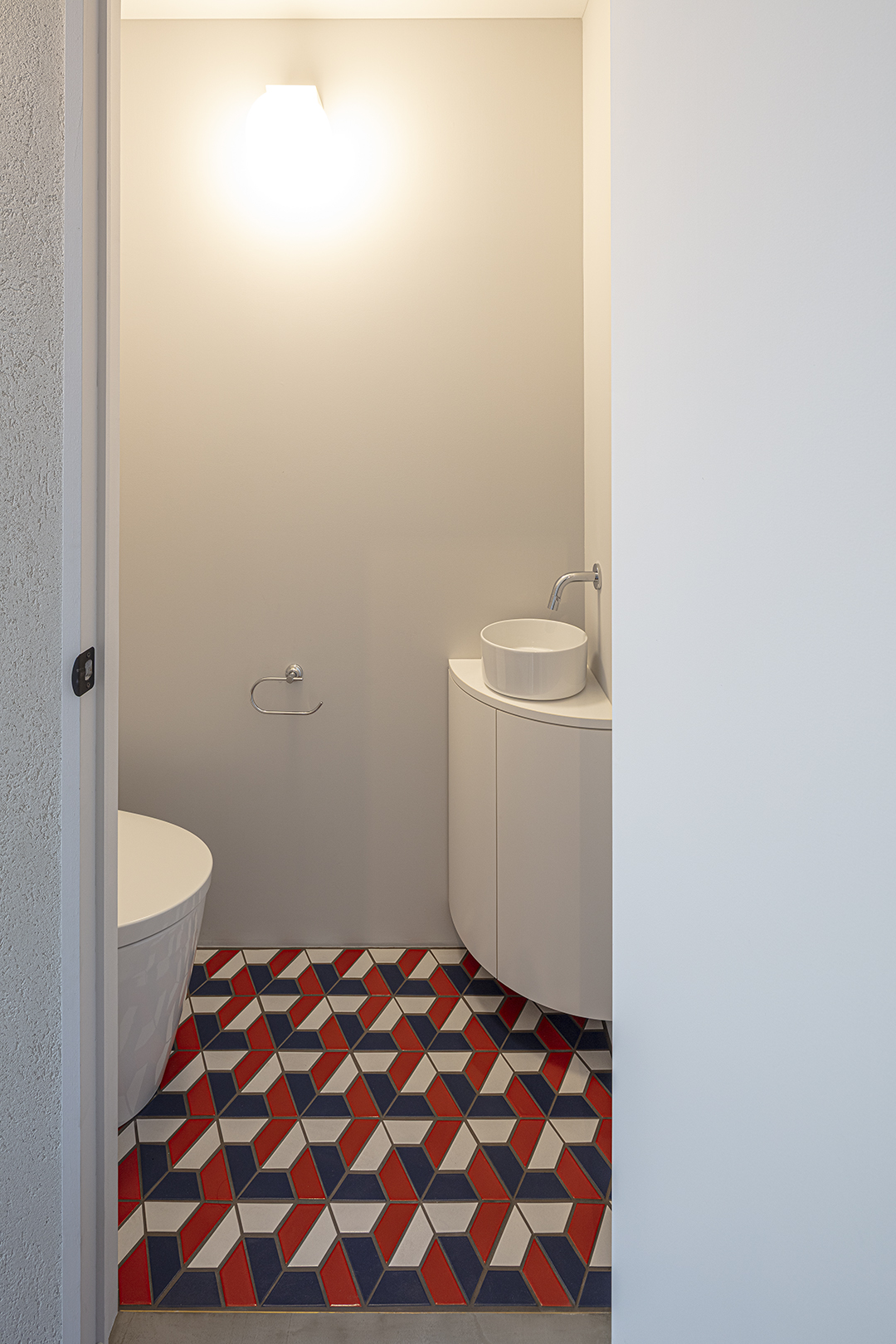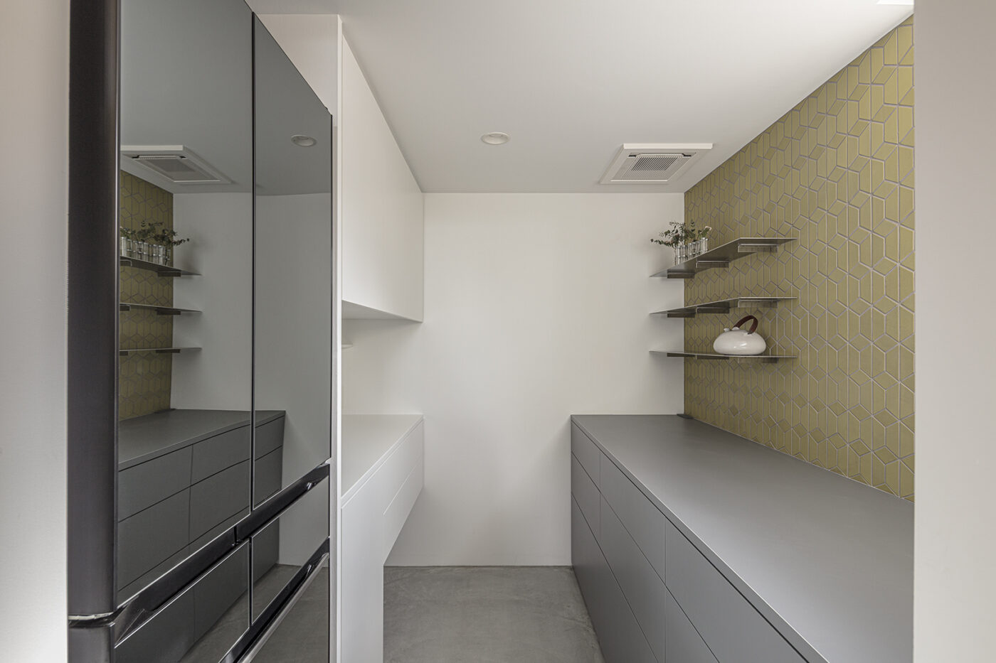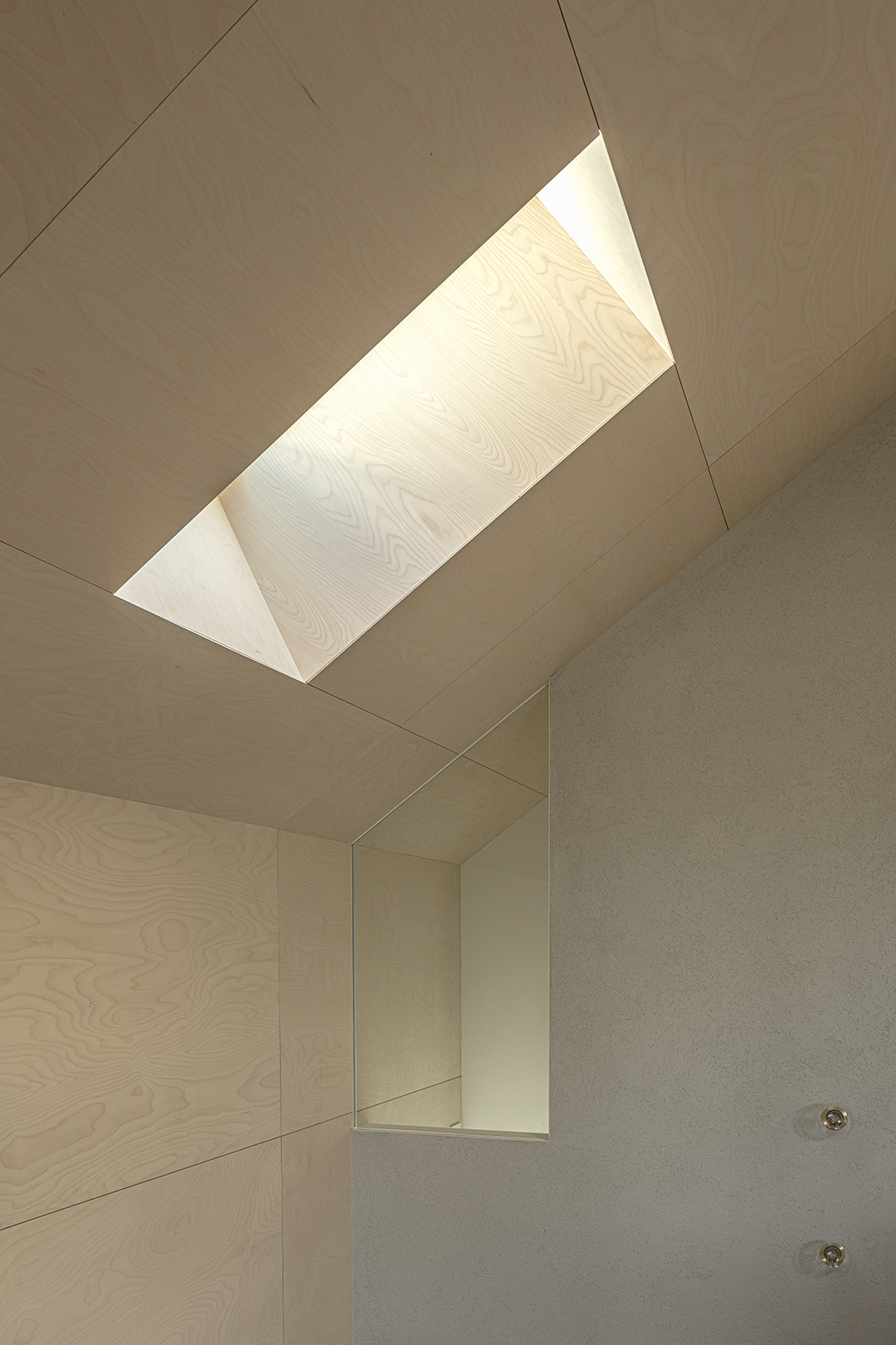 パントリーの壁やトイレ床に、色の楽しい輸入タイルを使っている。そうした仕上げの混在を、バーチ合板によるひとつながりの壁と天井面が包容する。