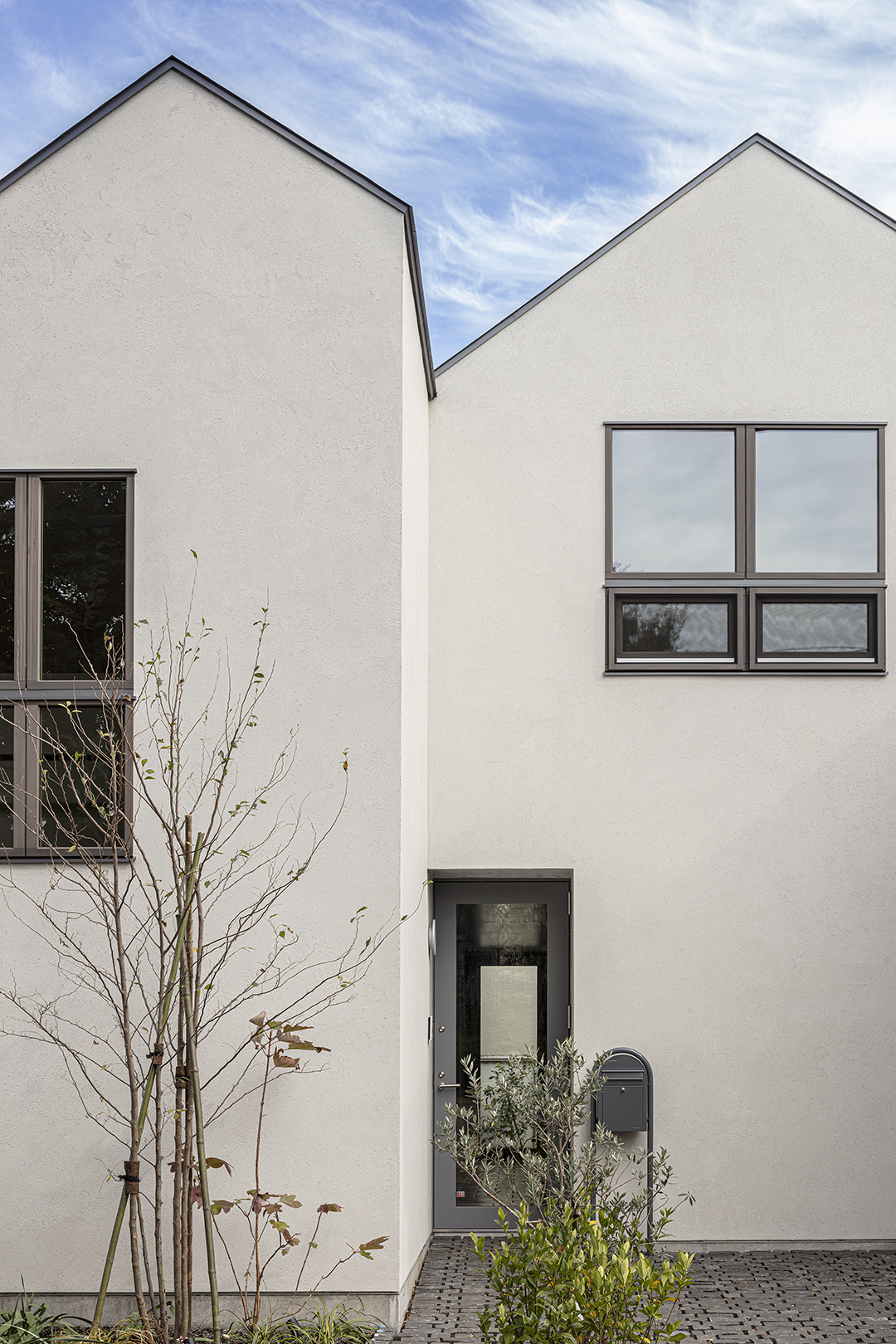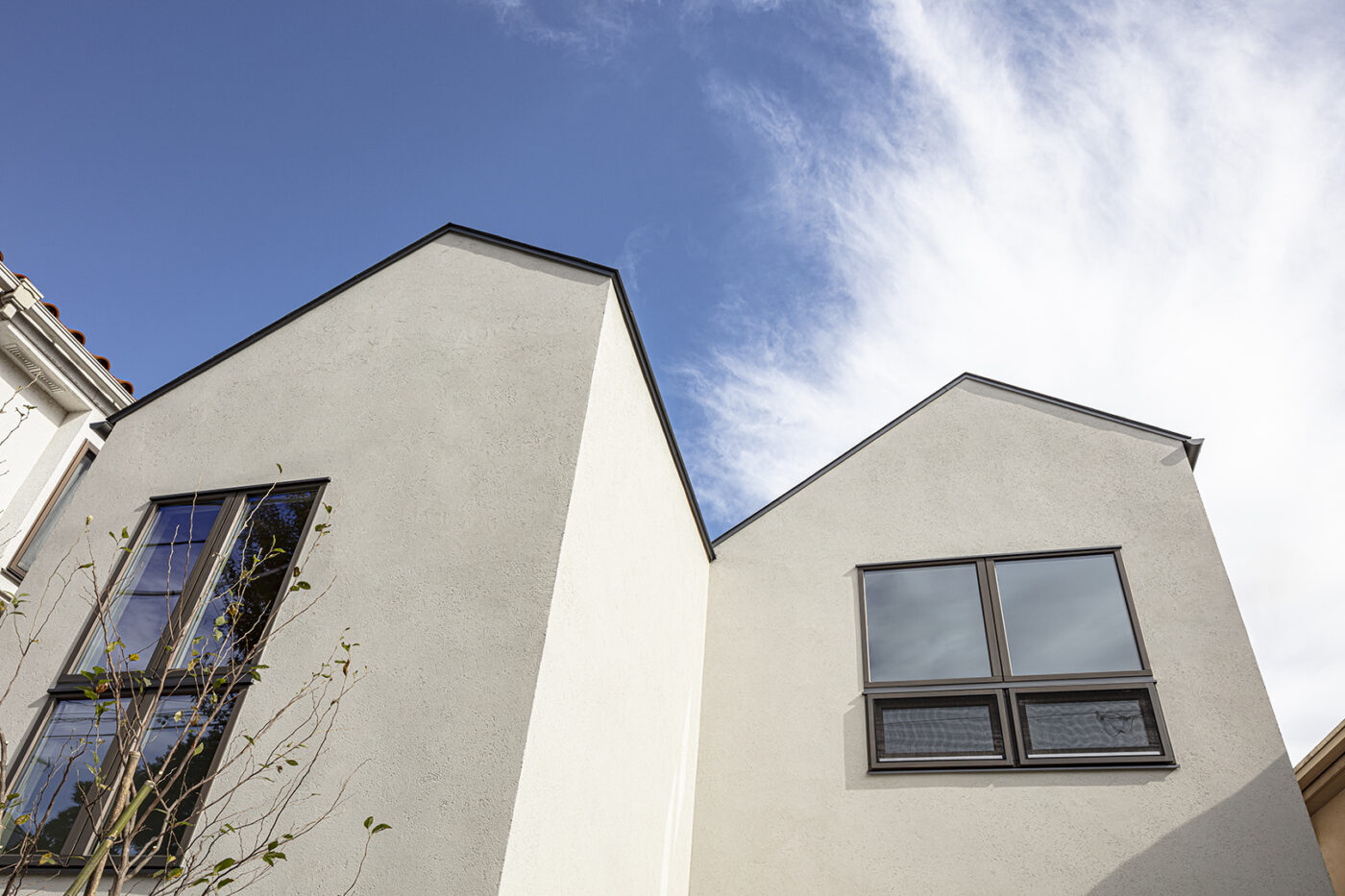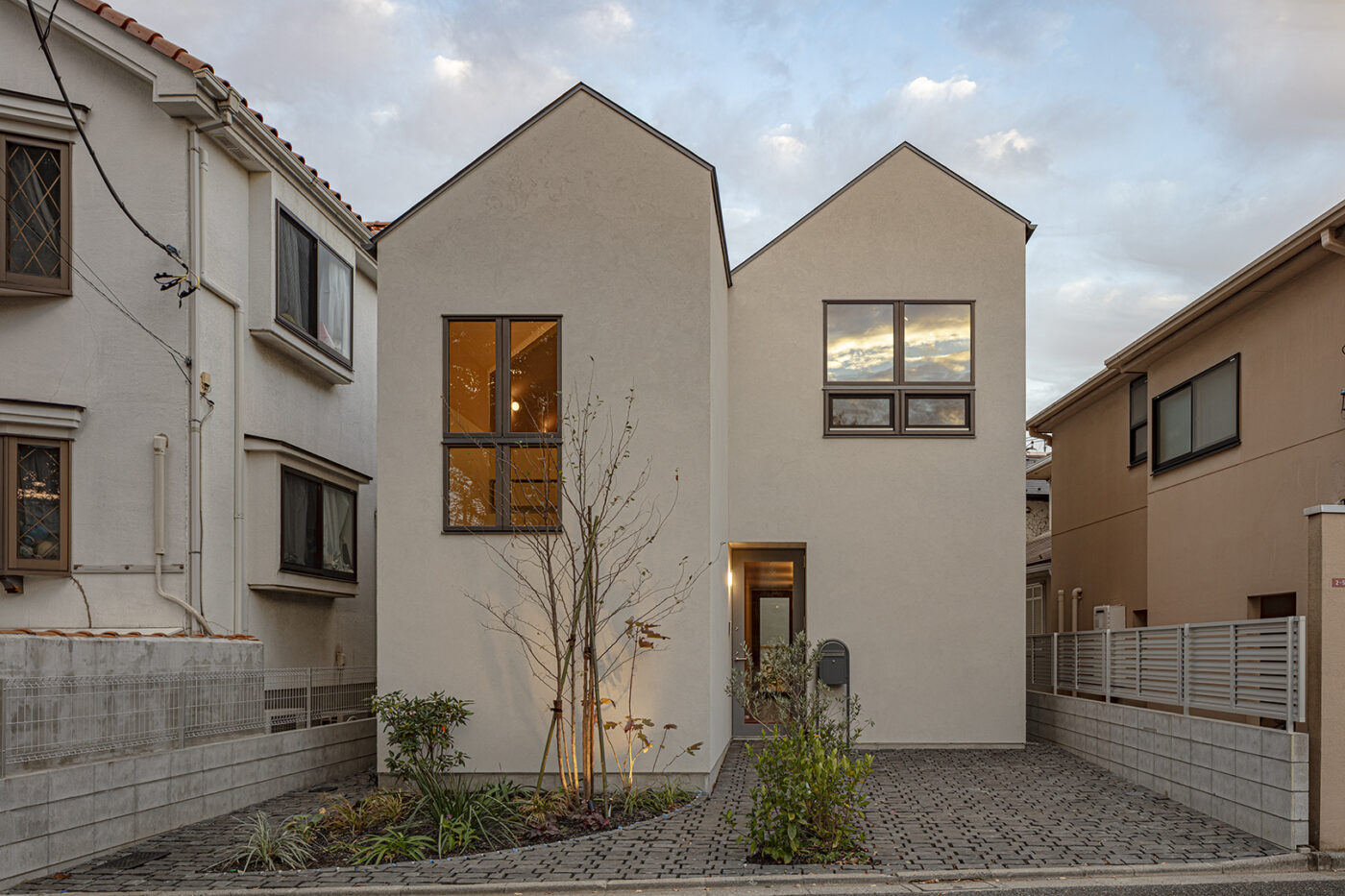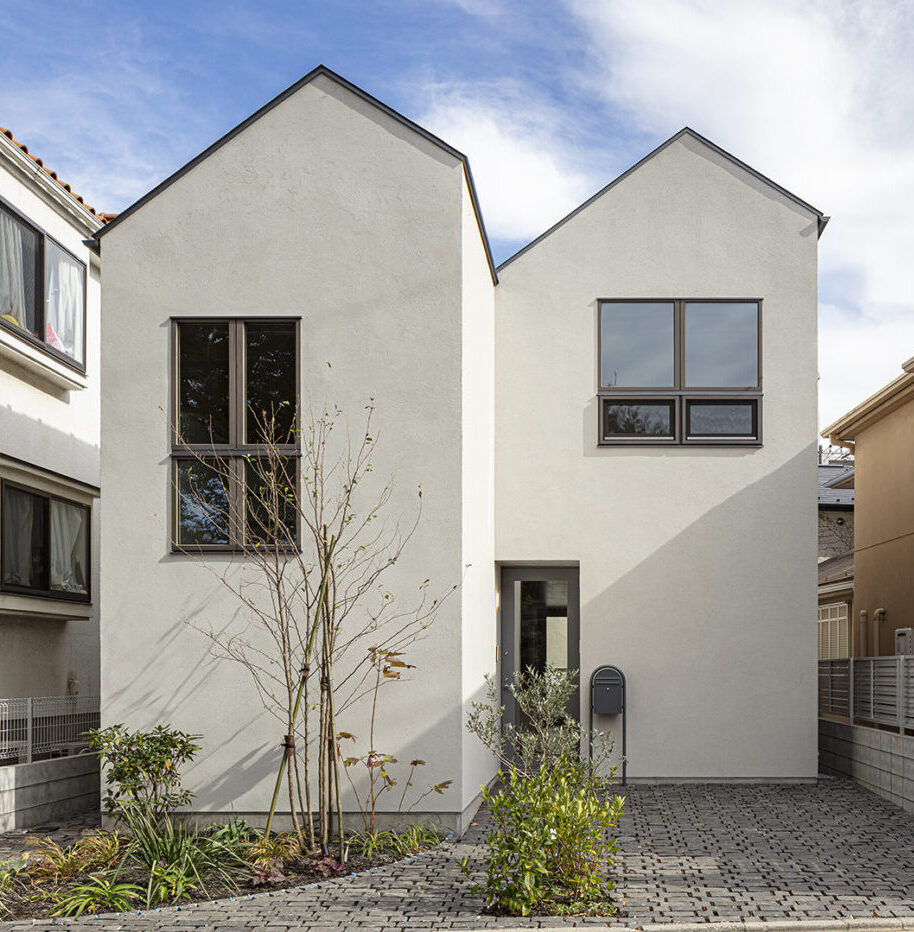 この地特有のおおらかな空気感を引き込むために、公園に面するファサードを分節させ、ほぼ相似形の家が2つ並び立つ形とした。それぞれの家は奥行きをずらして配置し、創作の拠点であるアトリエを街に近づけると同時に駐車スペースを確保した。