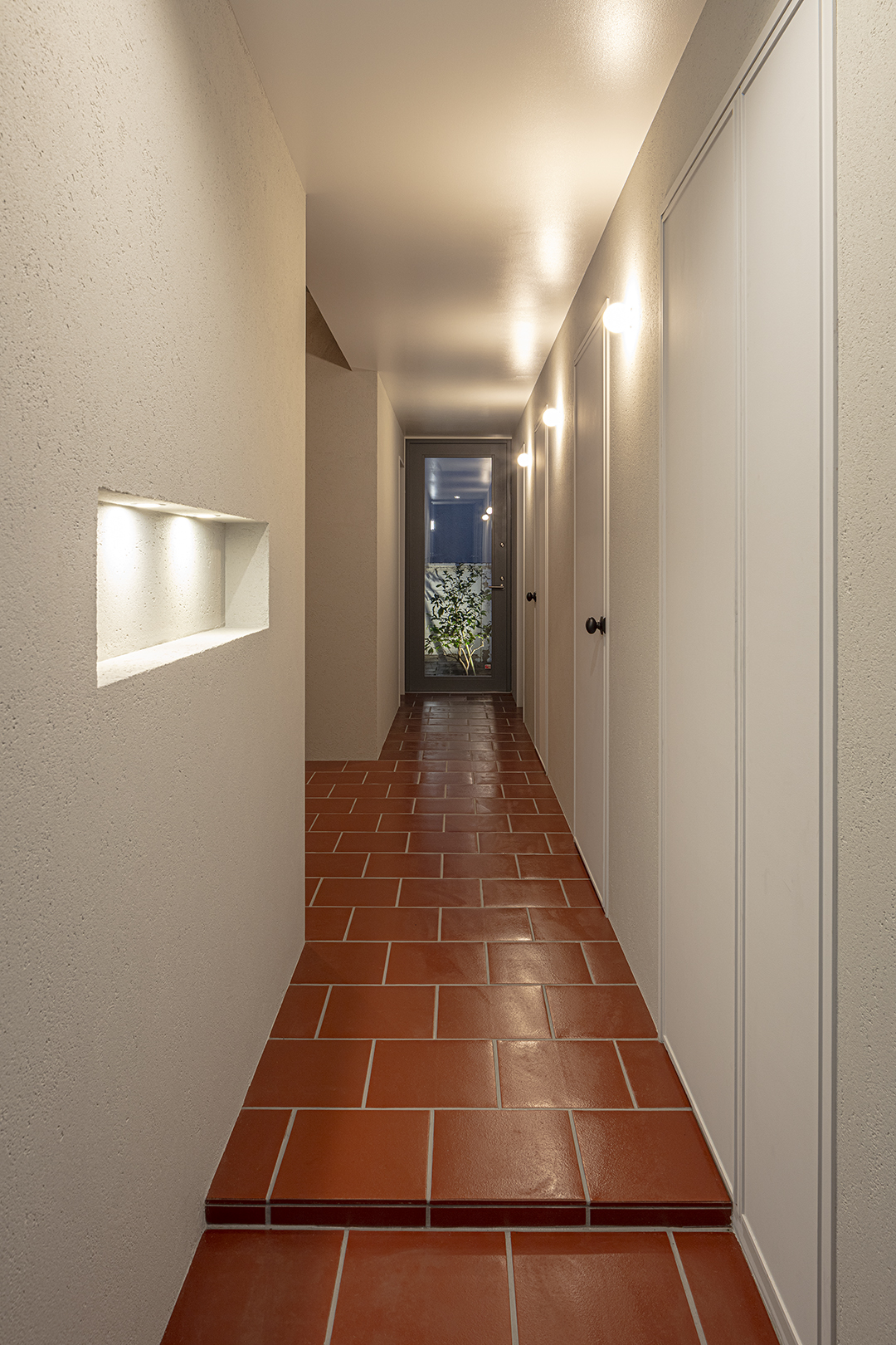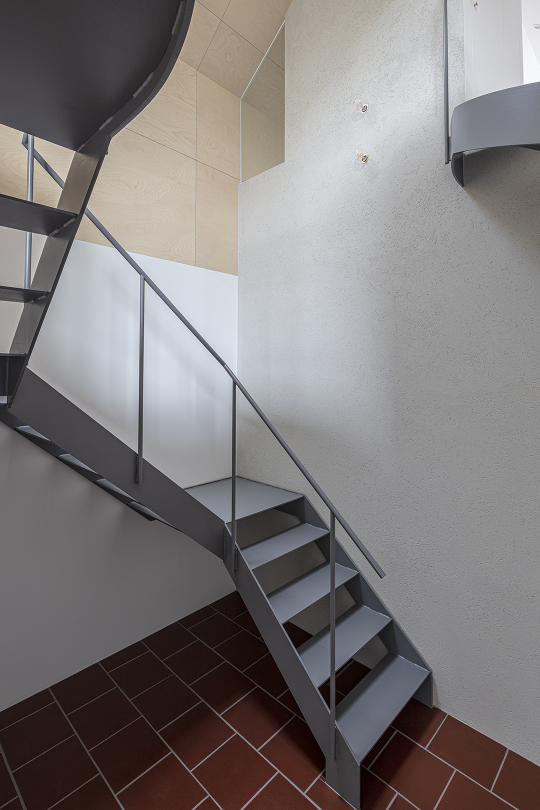 1階の路地的スペースはテラコッタカラーのタイルと外壁仕様の壁で仕上げ、2階は床のモルタル仕上げを一部手すりやキッチンカウンターに展開した。
