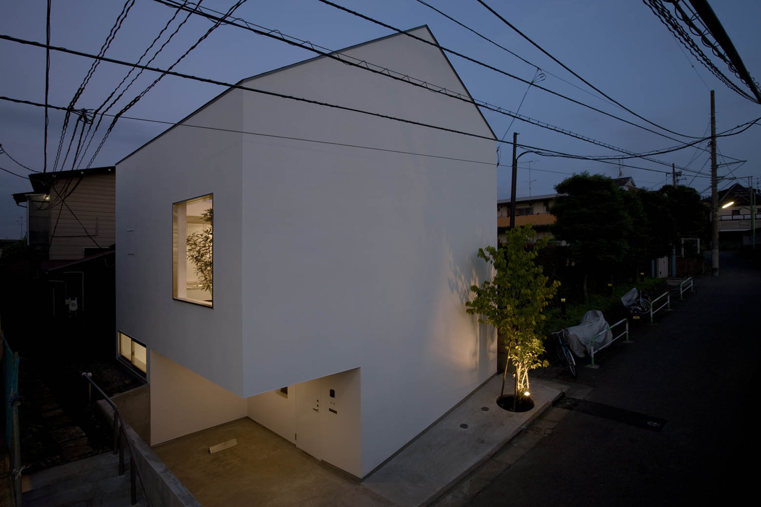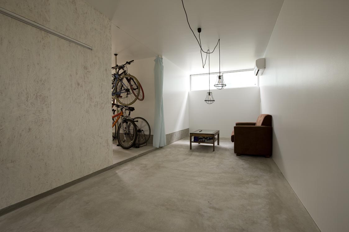 許容建築面積の最大である一辺6.58mの正方形プランを設定し、北側からかかる高度斜線に沿うように屋根をかけた。地面に半ば埋まる地階を収納とエントランス動線と子ども部屋、傾斜地のためおよそ2階レベルに相当する1階を一辺6.58mのLDKとテラスとし、その上部に浮かぶ小屋のような2階を寝室、テラスの一部を浴室とした。