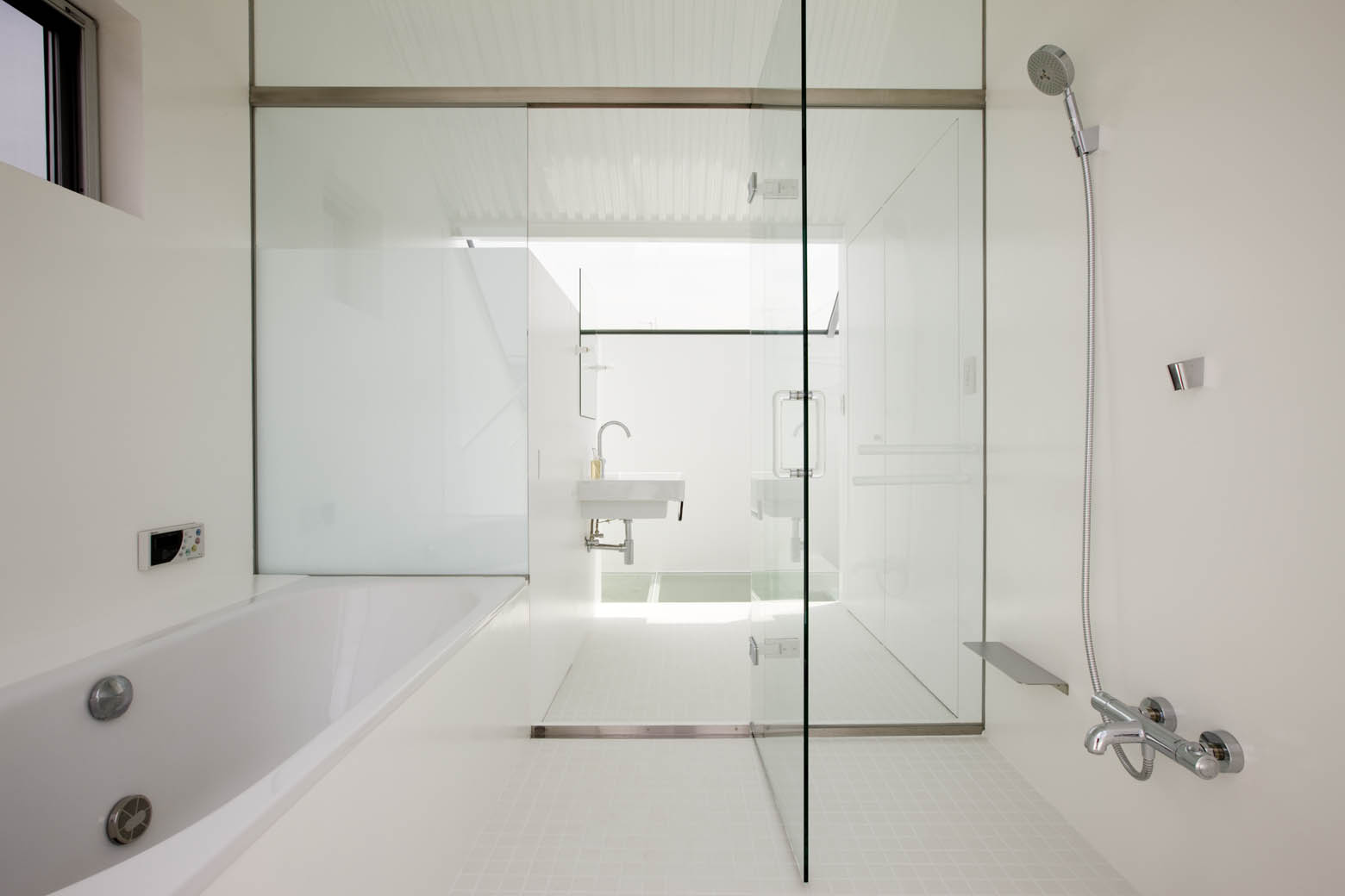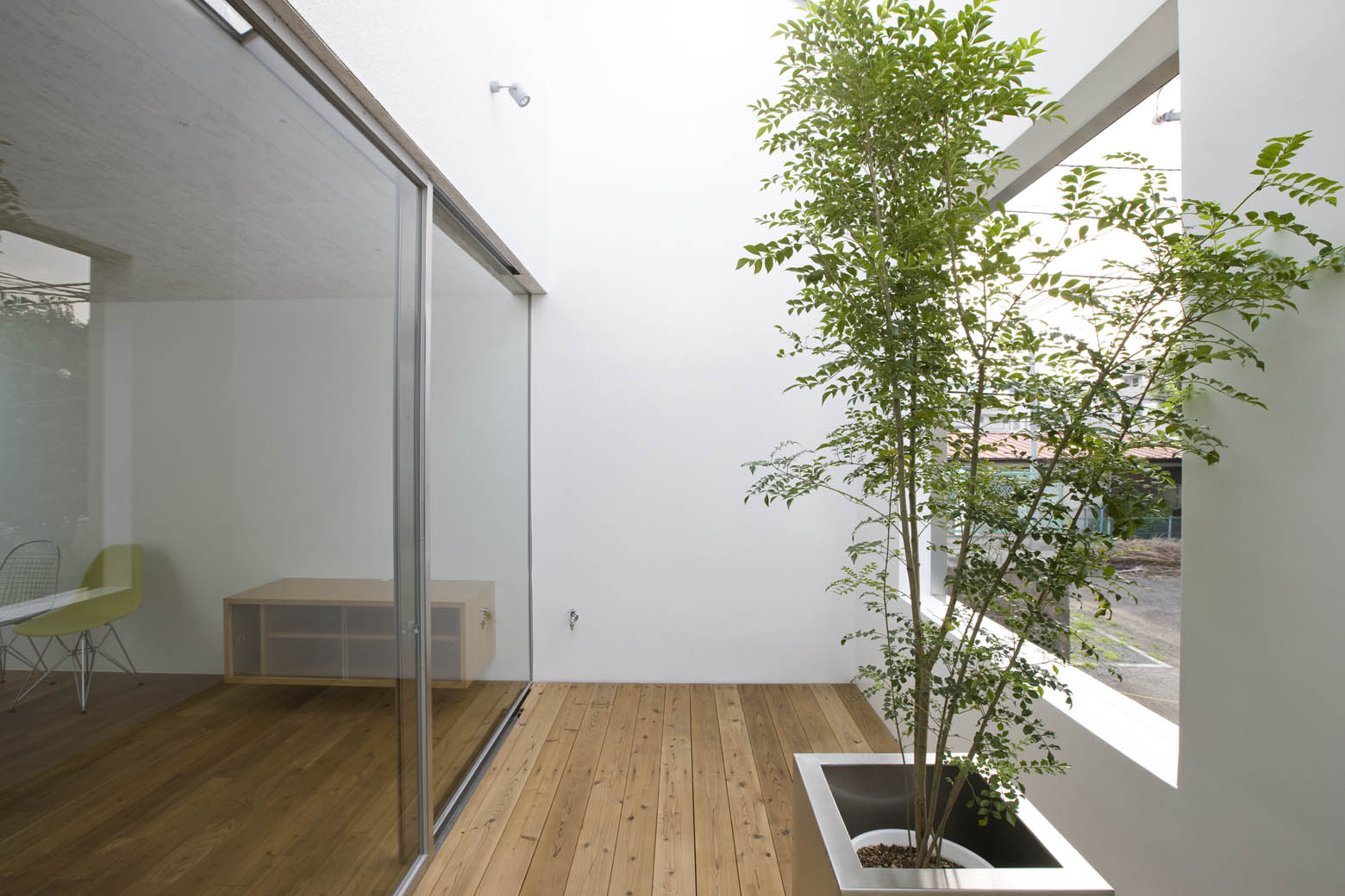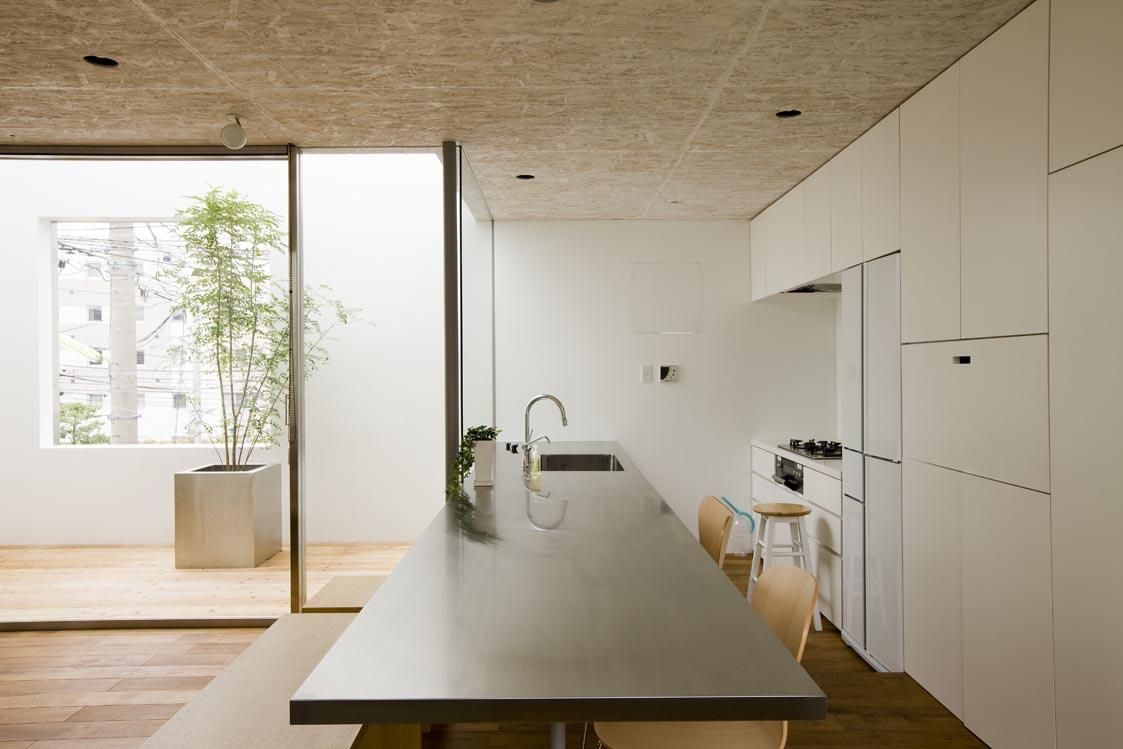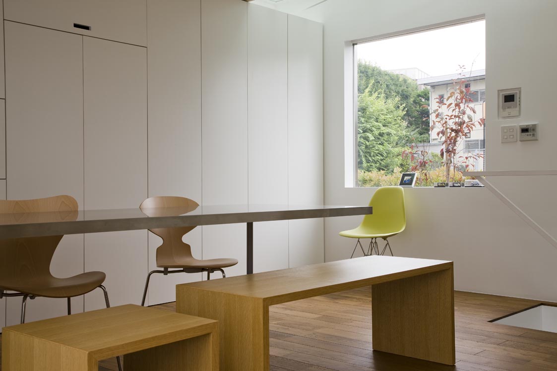 敷地面積や高度斜線による高さ制限など都内の住宅地としてリアリティある条件のもと、過剰も不足もなく、外部空間と住空間とが融合することで根源的な快適性が生み出される。