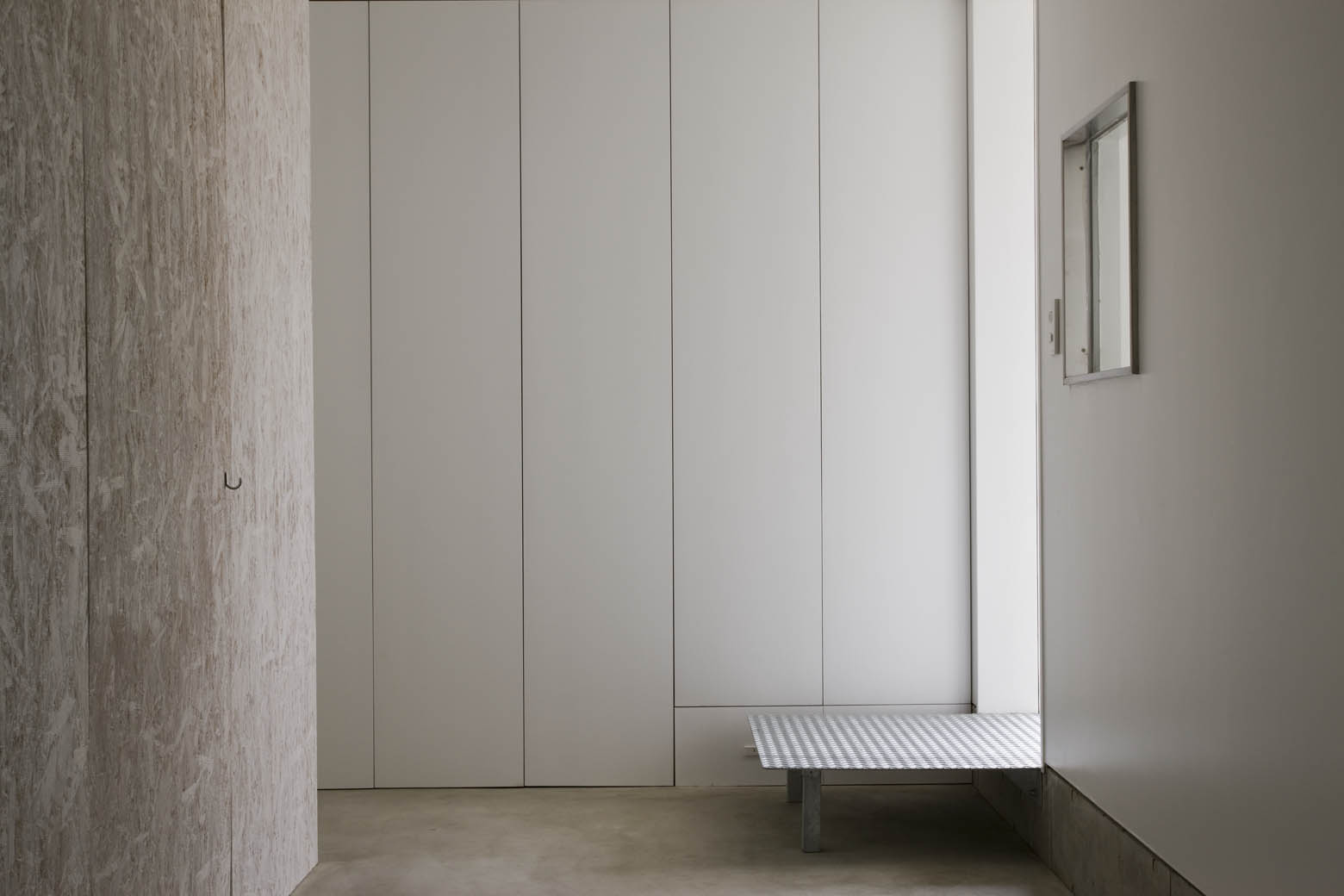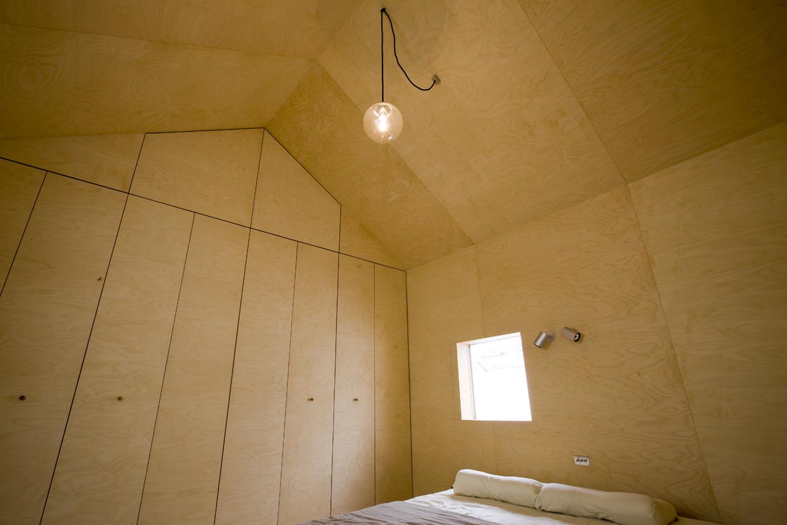 2階の寝室は壁天井ともにバーチ合板仕上げ。棟を中心に左右対称の家型であるこの寝室は、トップライトに開かれた外部のような階段を上ってから辿り着くことも相まって、もうひとつの「家」のように感じられる。外と切り離されており、開放的な下階のリビングとは対照的な部屋である。