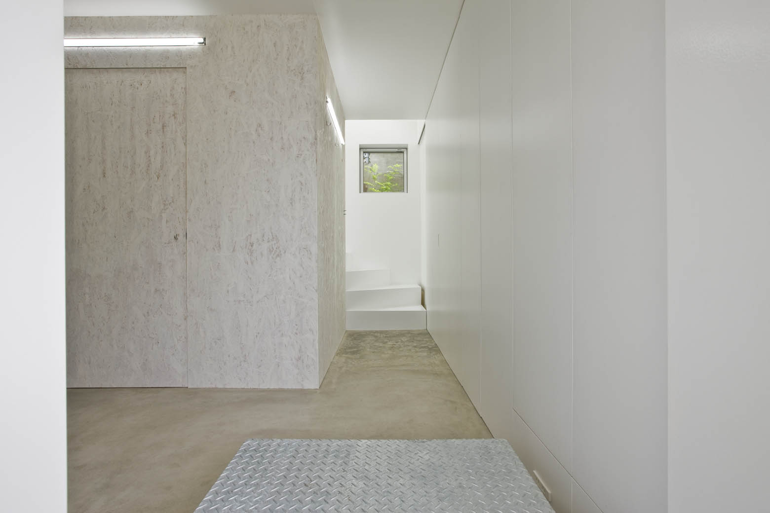 厳しい高度斜線をクリアしながら望ましい天井高を確保するため、玄関を入ると一段下りて室内へと入る形式とした。