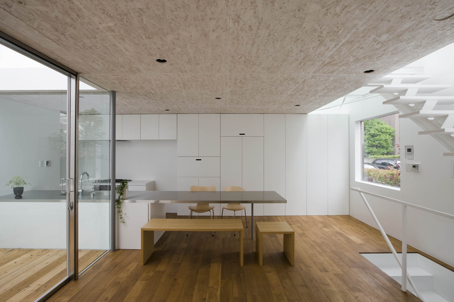 1階リビングルームの南、階段上部のトップライトはスケルトンな階段を介し地下まで光を導き、一方北のテラスは空へ開放されている。南北どちらも上部に抜けていることから、天井面はリビングルームに軒下空間がもつ半屋外的な雰囲気を創出する。