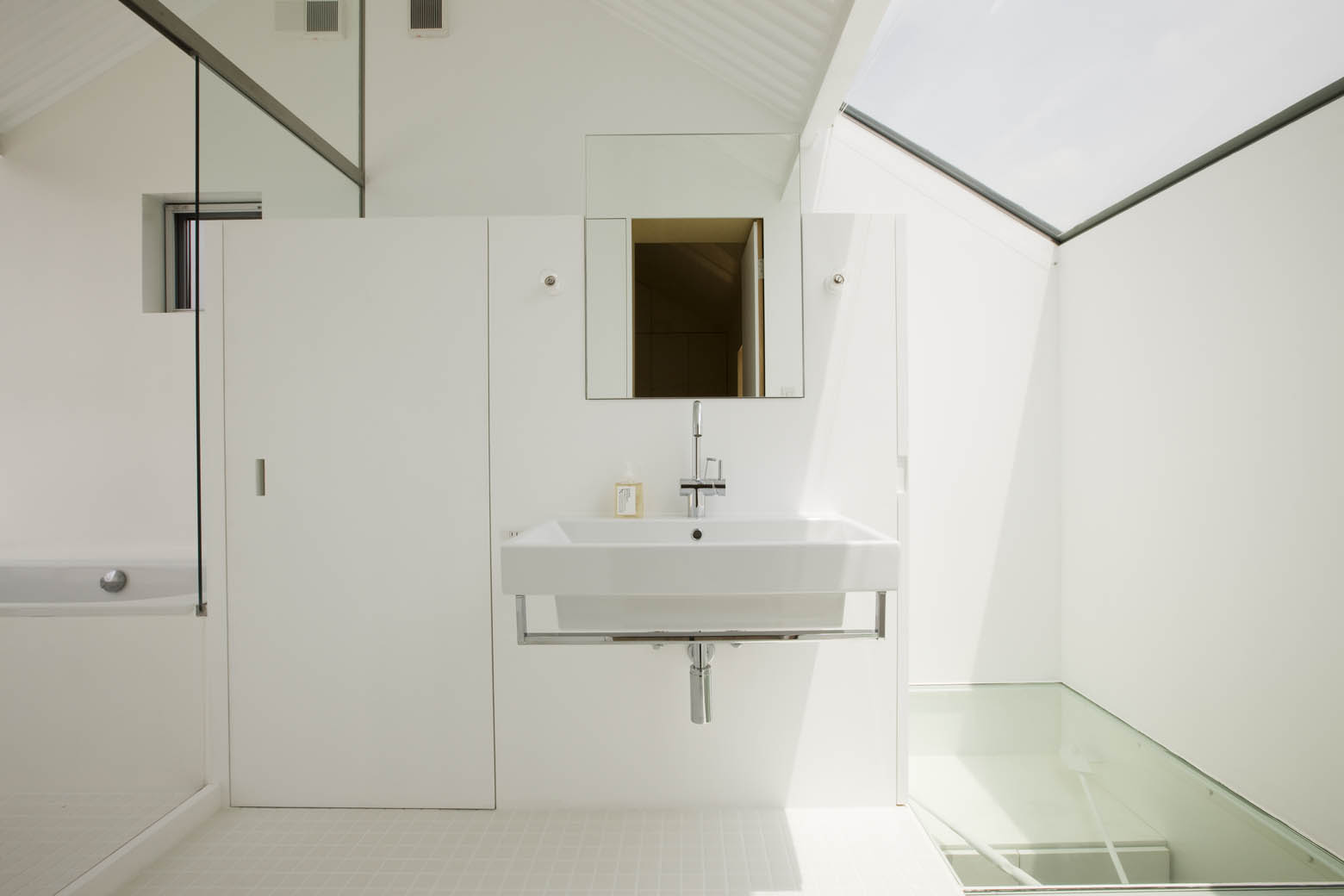 2階浴室と水回りの天井はH型鋼の梁や屋根下地のキーストンプレートが表しとなっており、トップライトとも相まって露天風呂のような開放感を得られる。