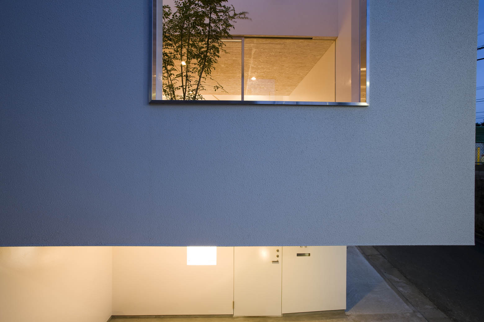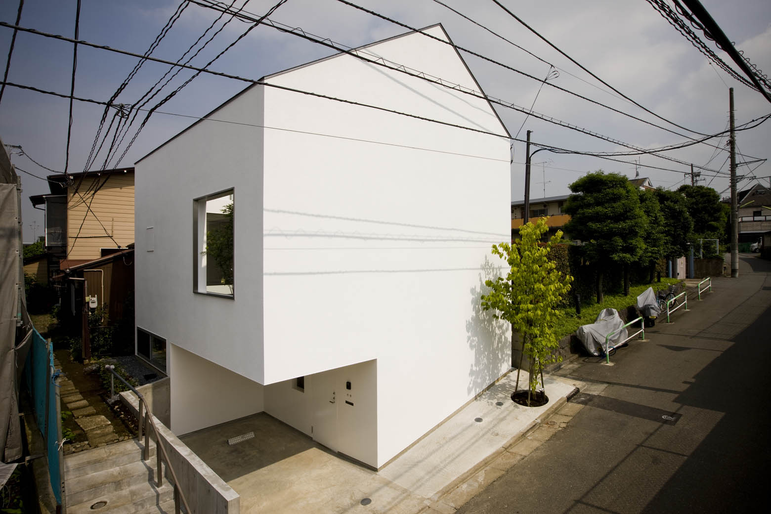 世田谷の住宅地、なだらかに起伏の続く住宅地の一角に建つ住宅である。 間口奥行きともに8.5mほどの敷地には、対角方向に1.4mの高低差があった。