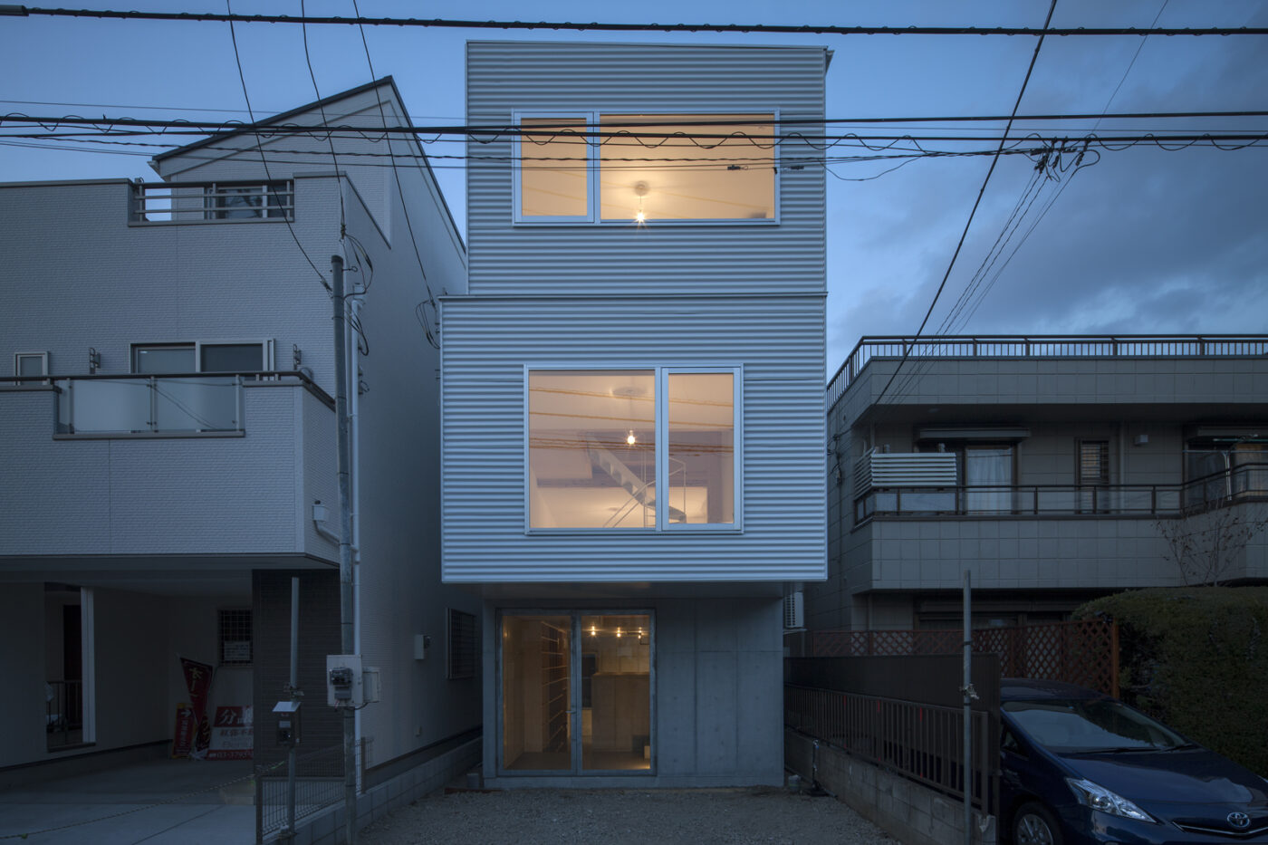 作品制作のために必要な間口・天井高・奥行きをもつアトリエを1階、2-3階を住居とするこの計画において、課題が2つあった。それは、間口が限られている(5.5m)ことと、高度斜線による高さ制限である。
