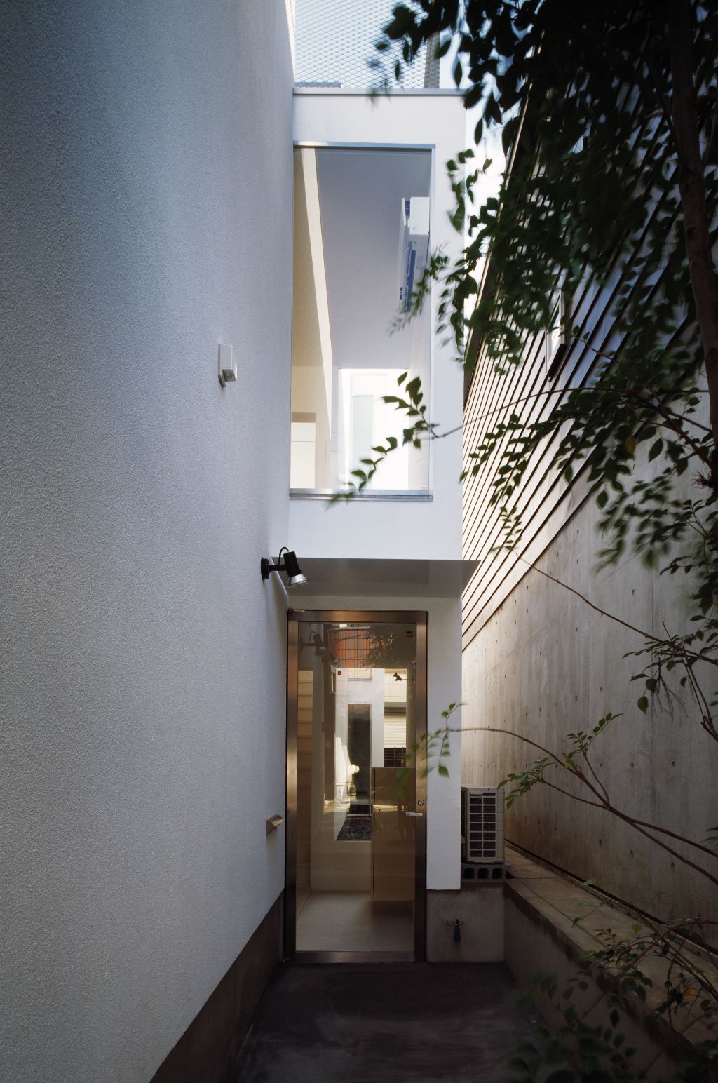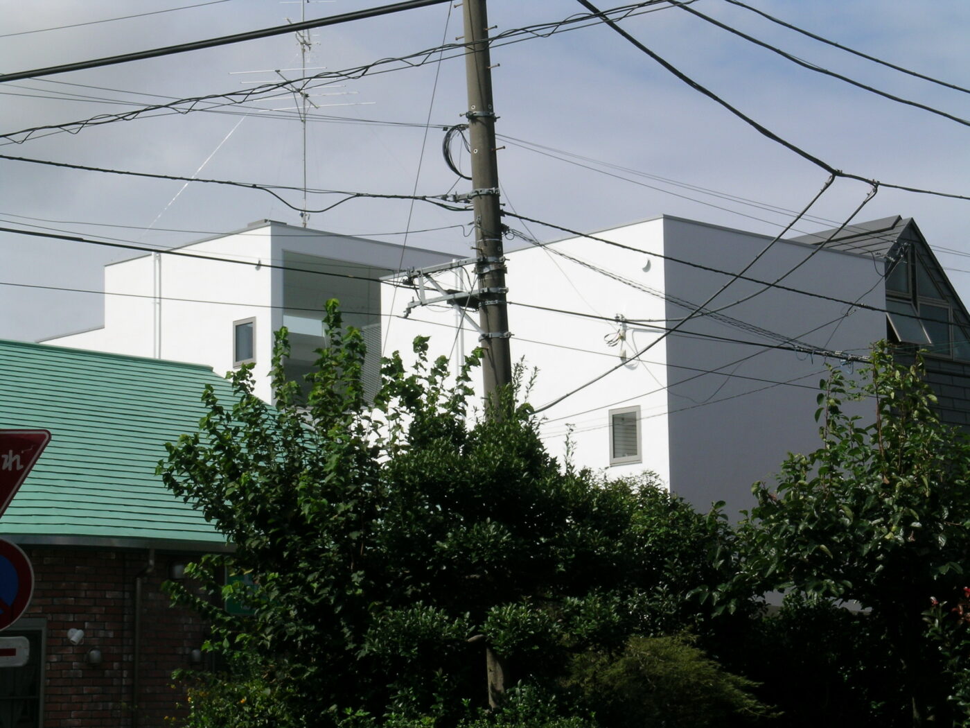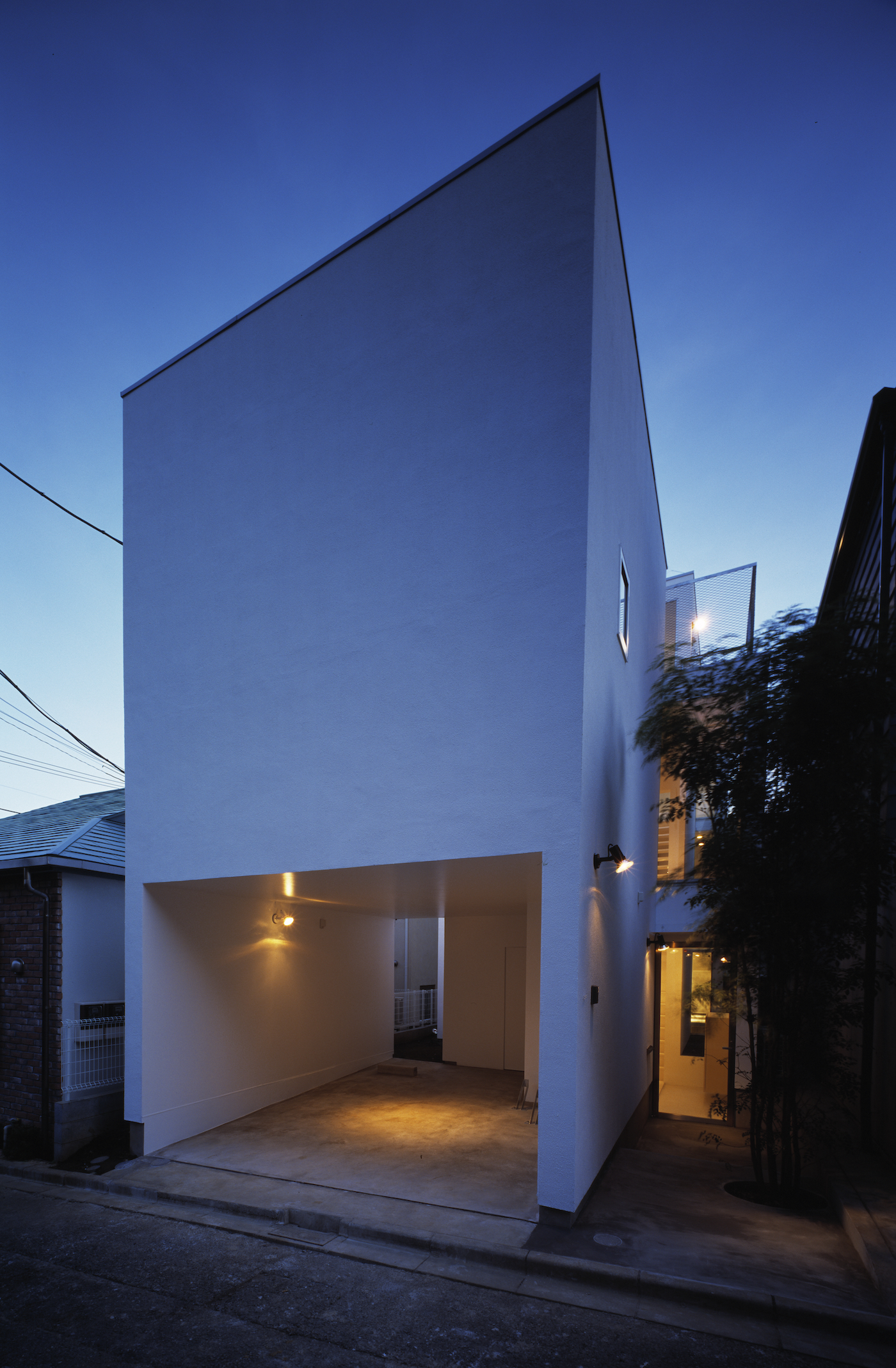 短冊状の敷地であるが、4つの棟がずれて並ぶことで敷地の中に小さな中庭をつくりながら、空や近隣の風景への開放性と包容感をあわせもつ住宅となっている。