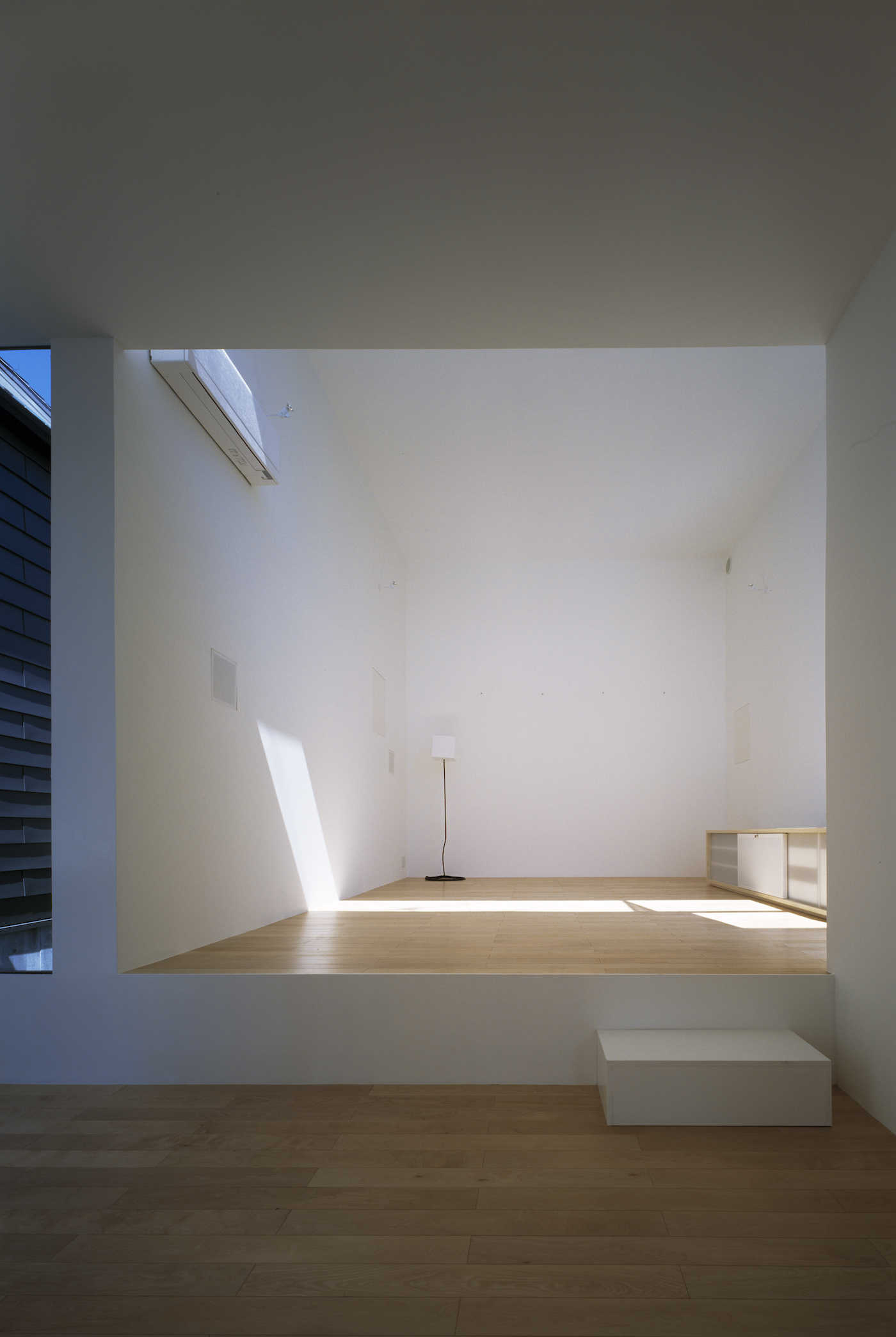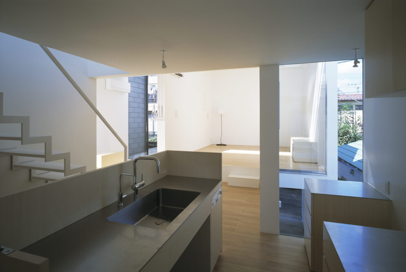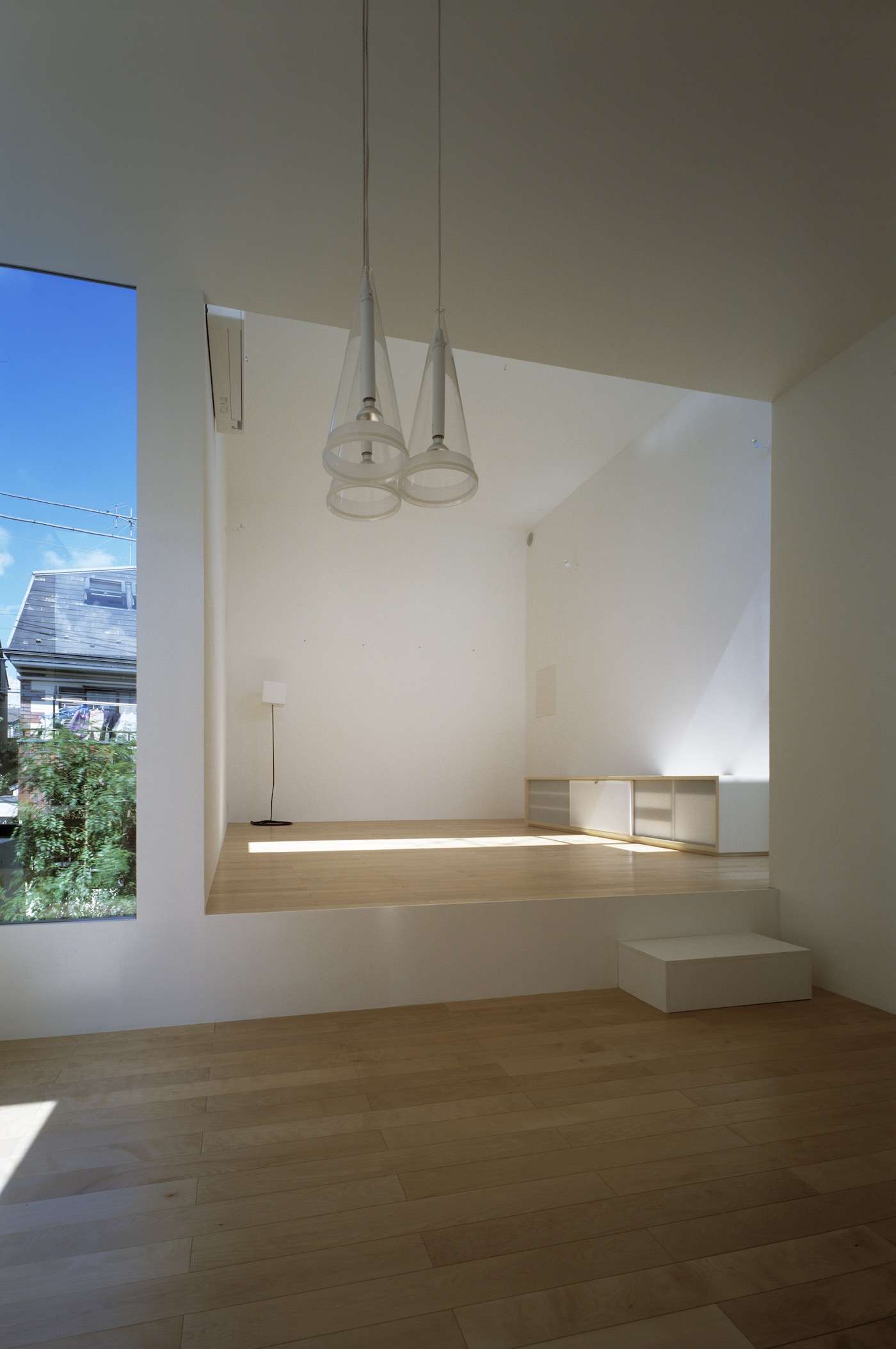 アプローチを抜けて玄関に入り、階段を上がると2階LDK。リビングは道路に面しているためプライバシーに配慮して、南側に開口をもたないシンプルなボリューム。しかし、ダイニングルームのあるボリュームとは平面的にも高さ的にもずれているので、ハイサイドライトからたっぷりの光が入る。高さのずれは、リビングとダイニングの床に40センチほどの高低差を生み、腰掛けるのにちょうどいい。