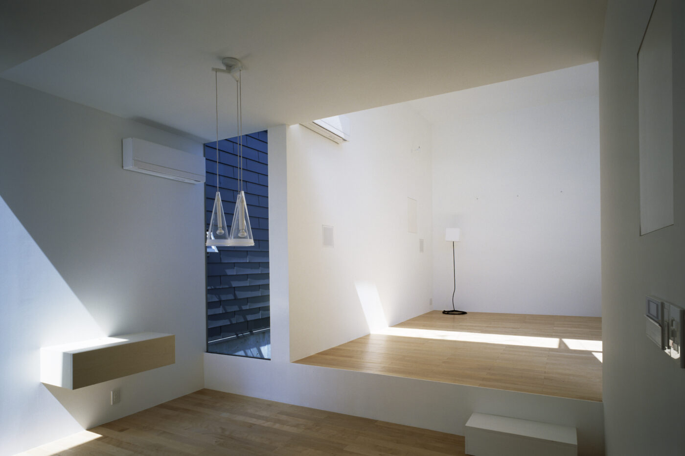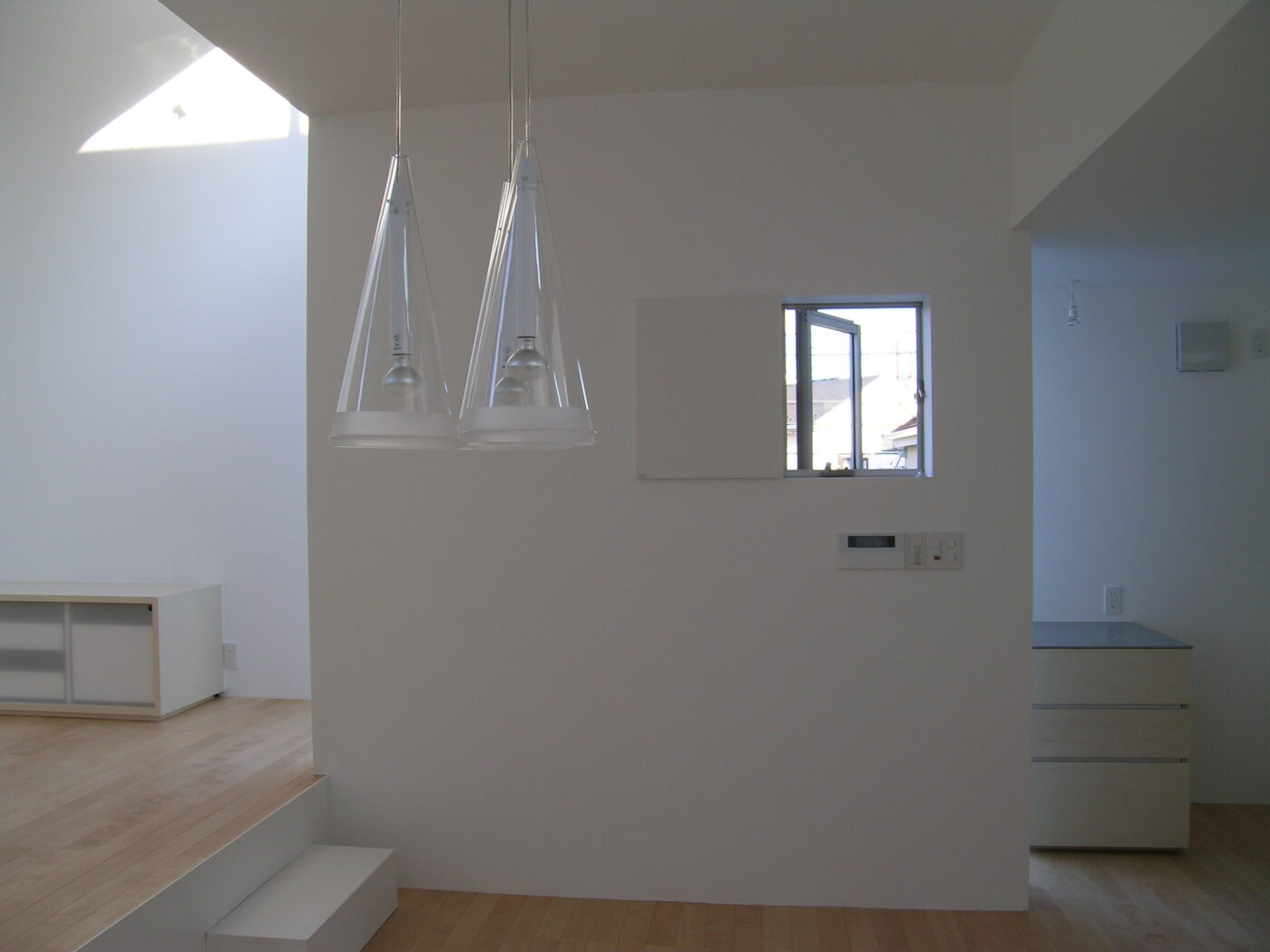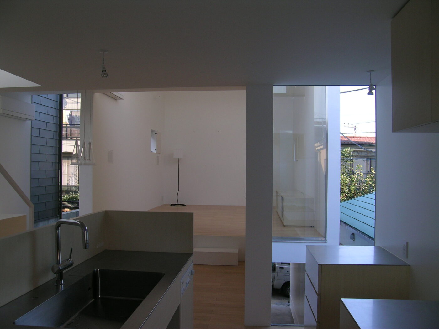 アプローチを抜けて玄関に入り、階段を上がると2階LDK。リビングは道路に面しているためプライバシーに配慮して、南側に開口をもたないシンプルなボリューム。しかし、ダイニングルームのあるボリュームとは平面的にも高さ的にもずれているので、ハイサイドライトからたっぷりの光が入る。高さのずれは、リビングとダイニングの床に40センチほどの高低差を生み、腰掛けるのにちょうどいい。
