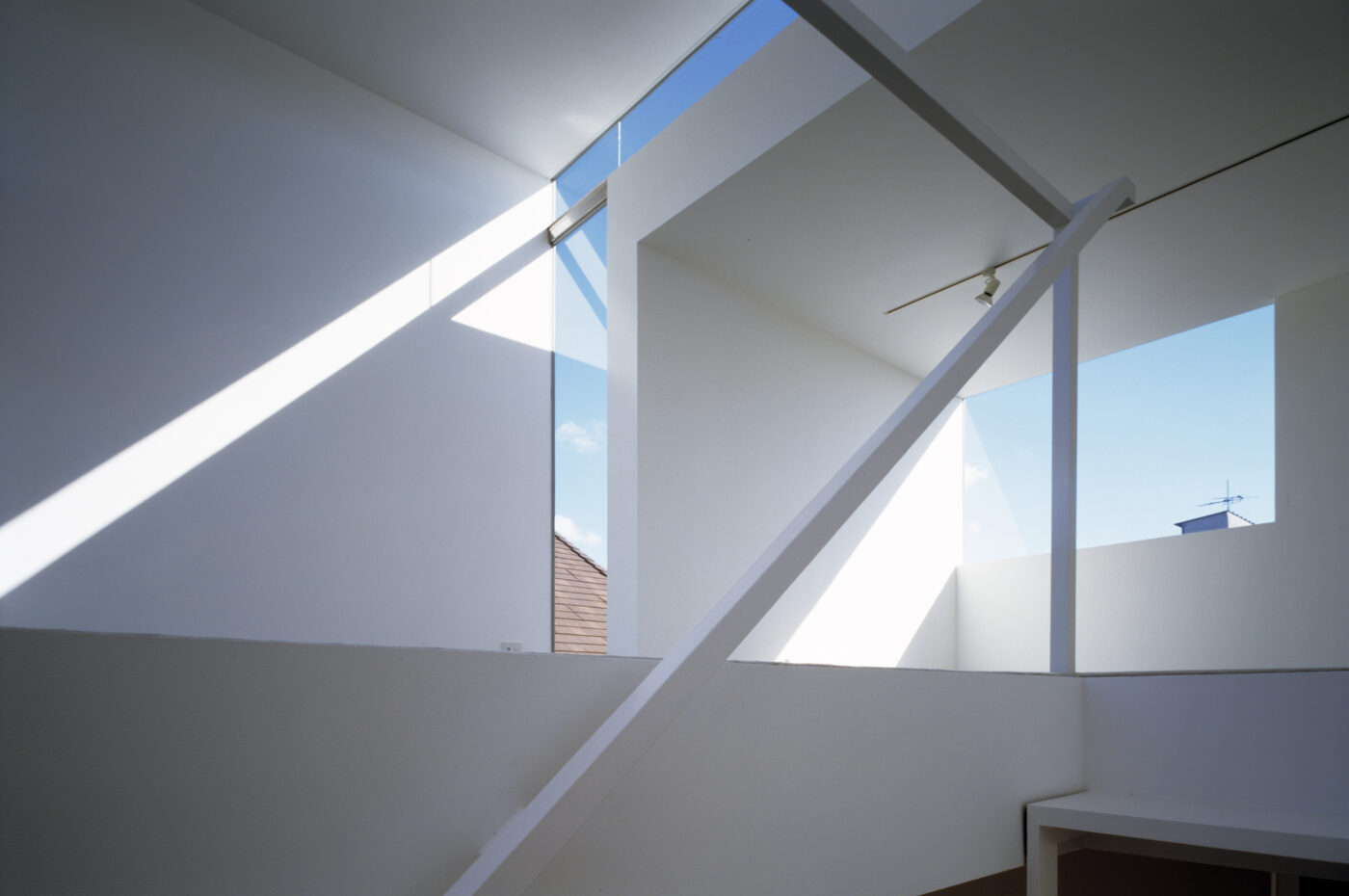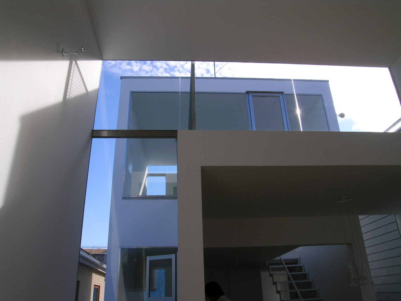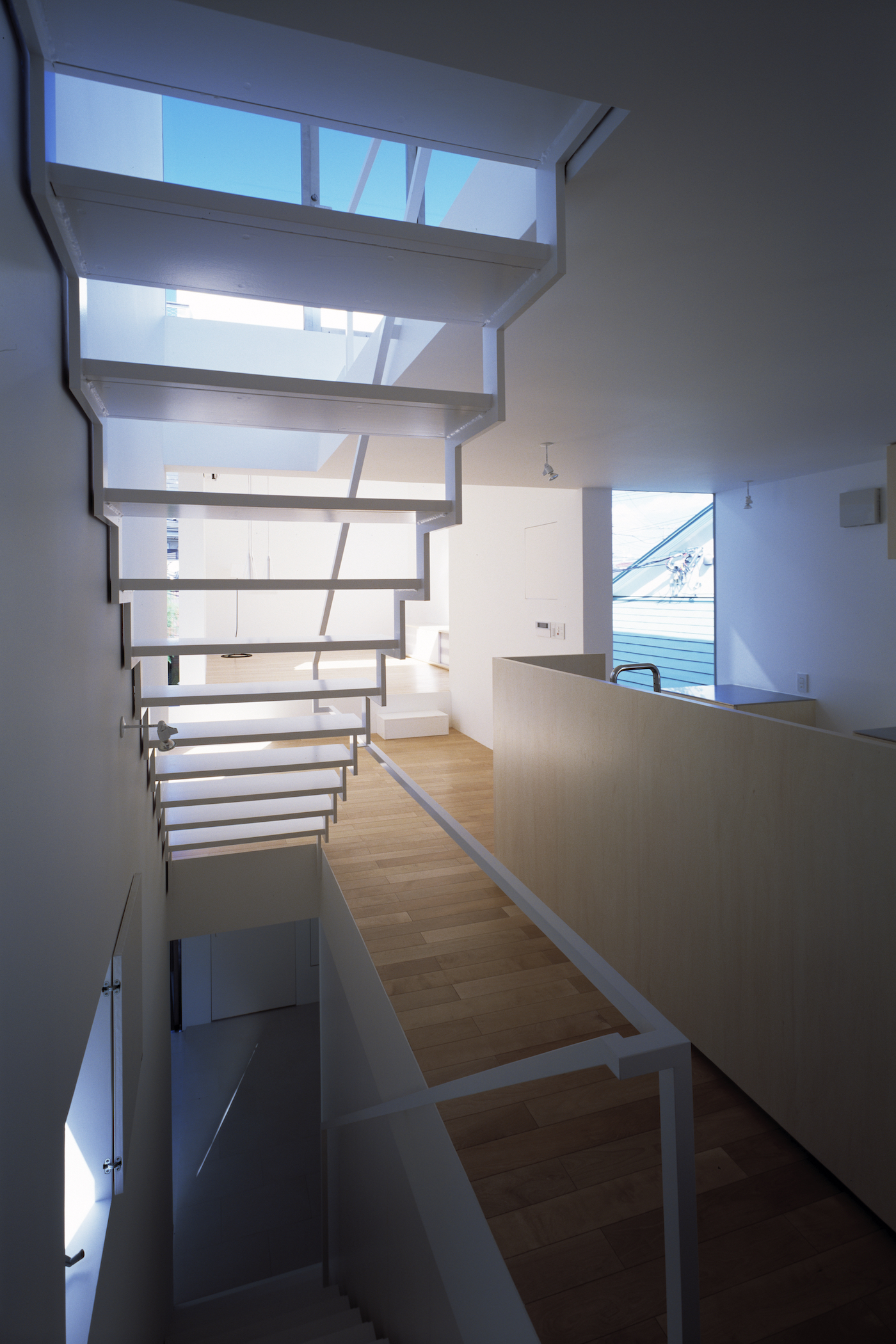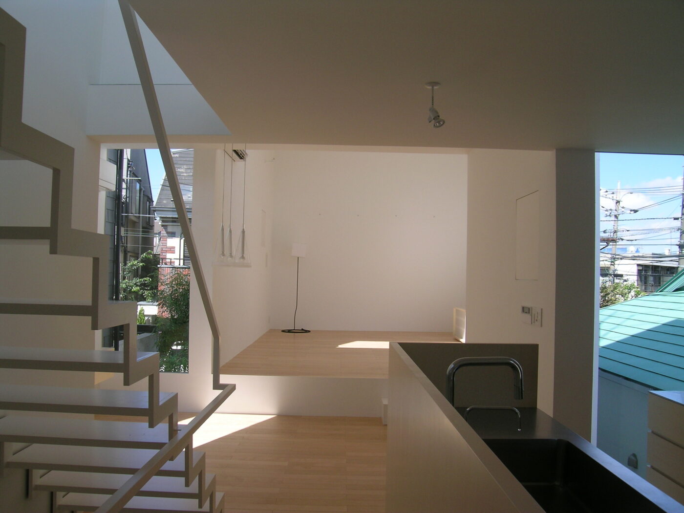 ダイニングから階段を上がって3階へ。門型ボリュームがつくるL字型の隙間が青空を切り取る。