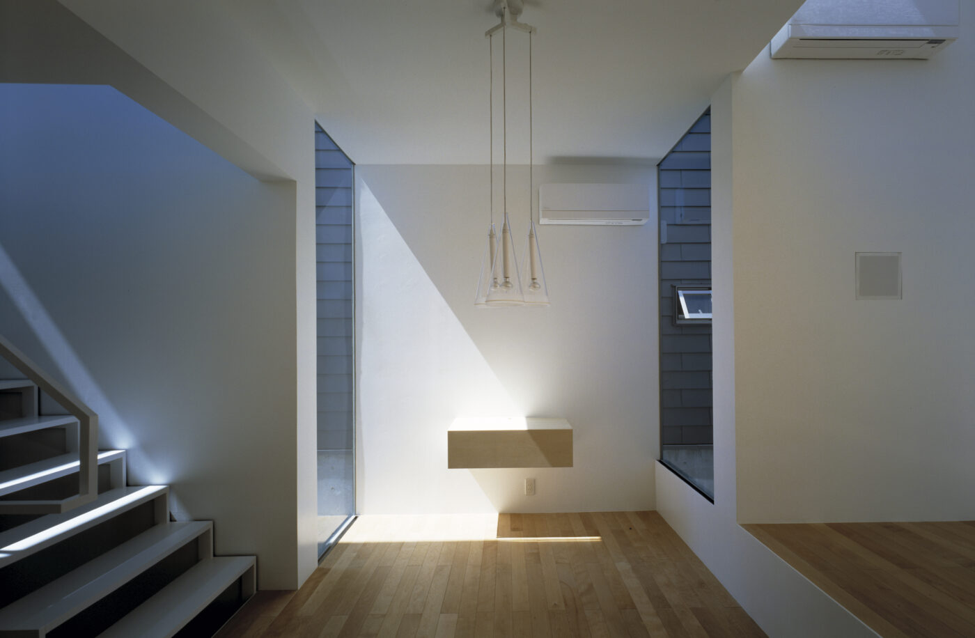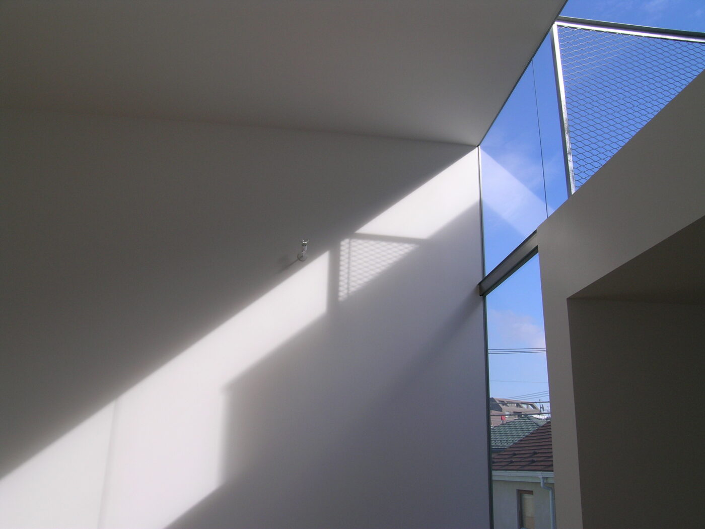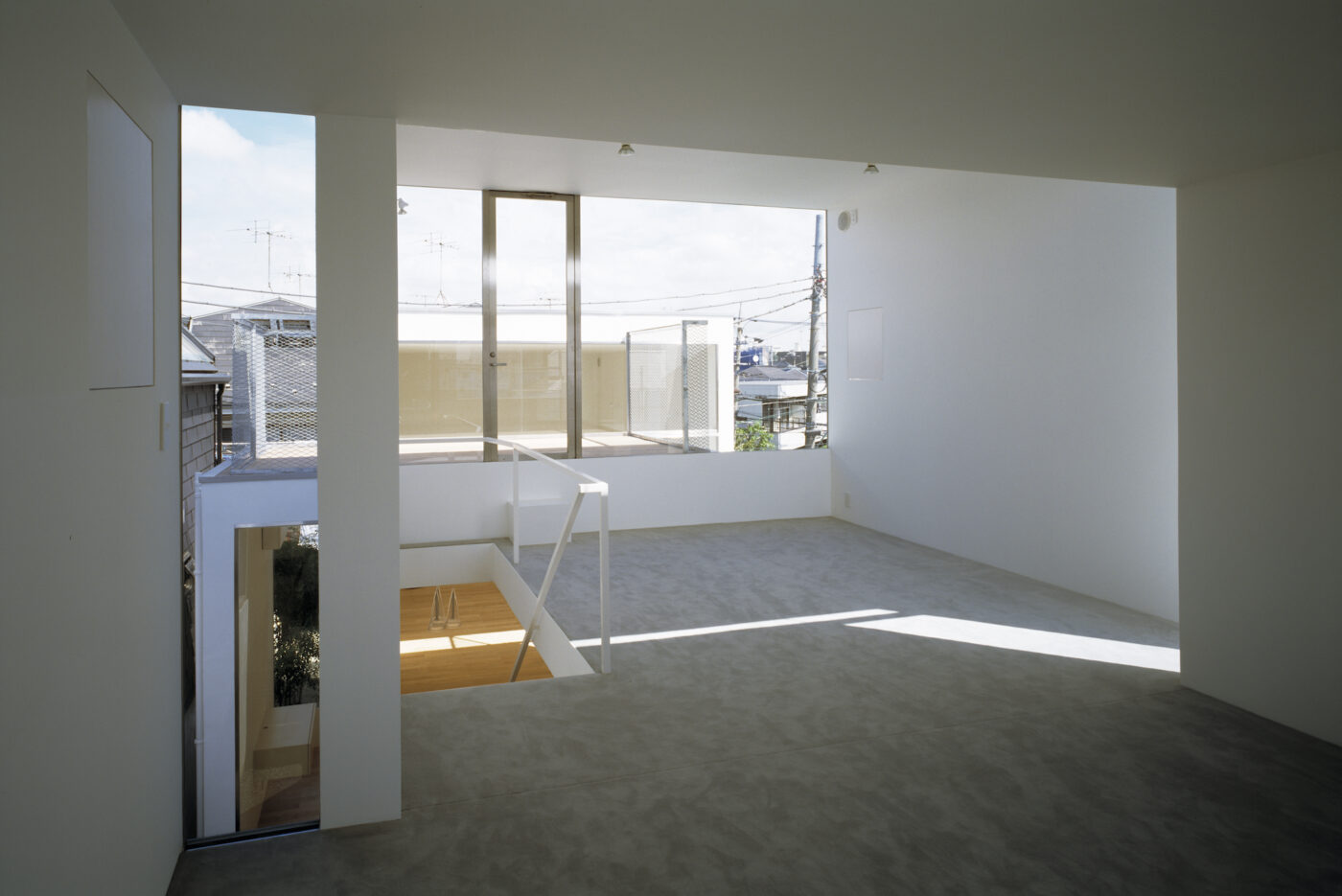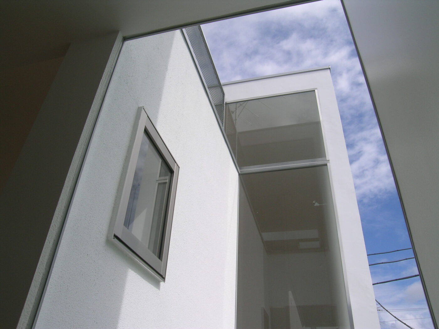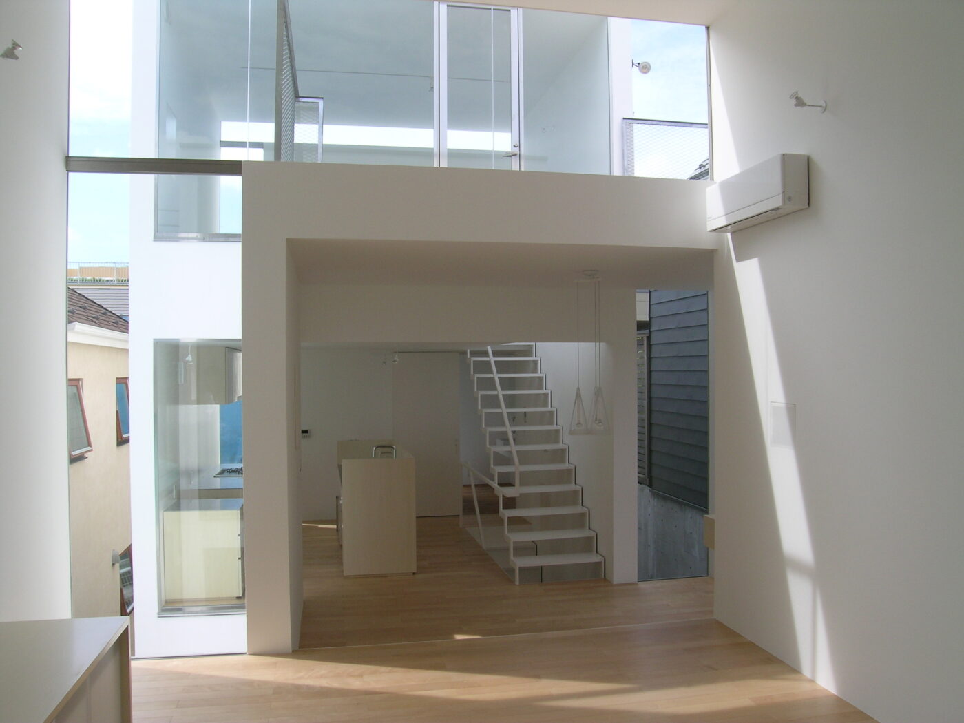 ダイニングから階段を上がって3階へ。門型ボリュームがつくるL字型の隙間が青空を切り取る。