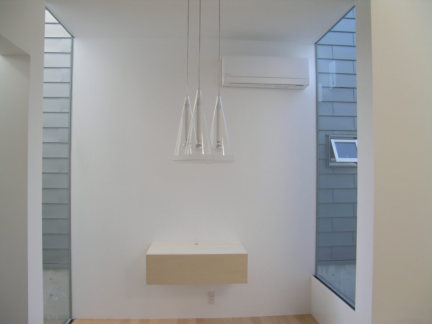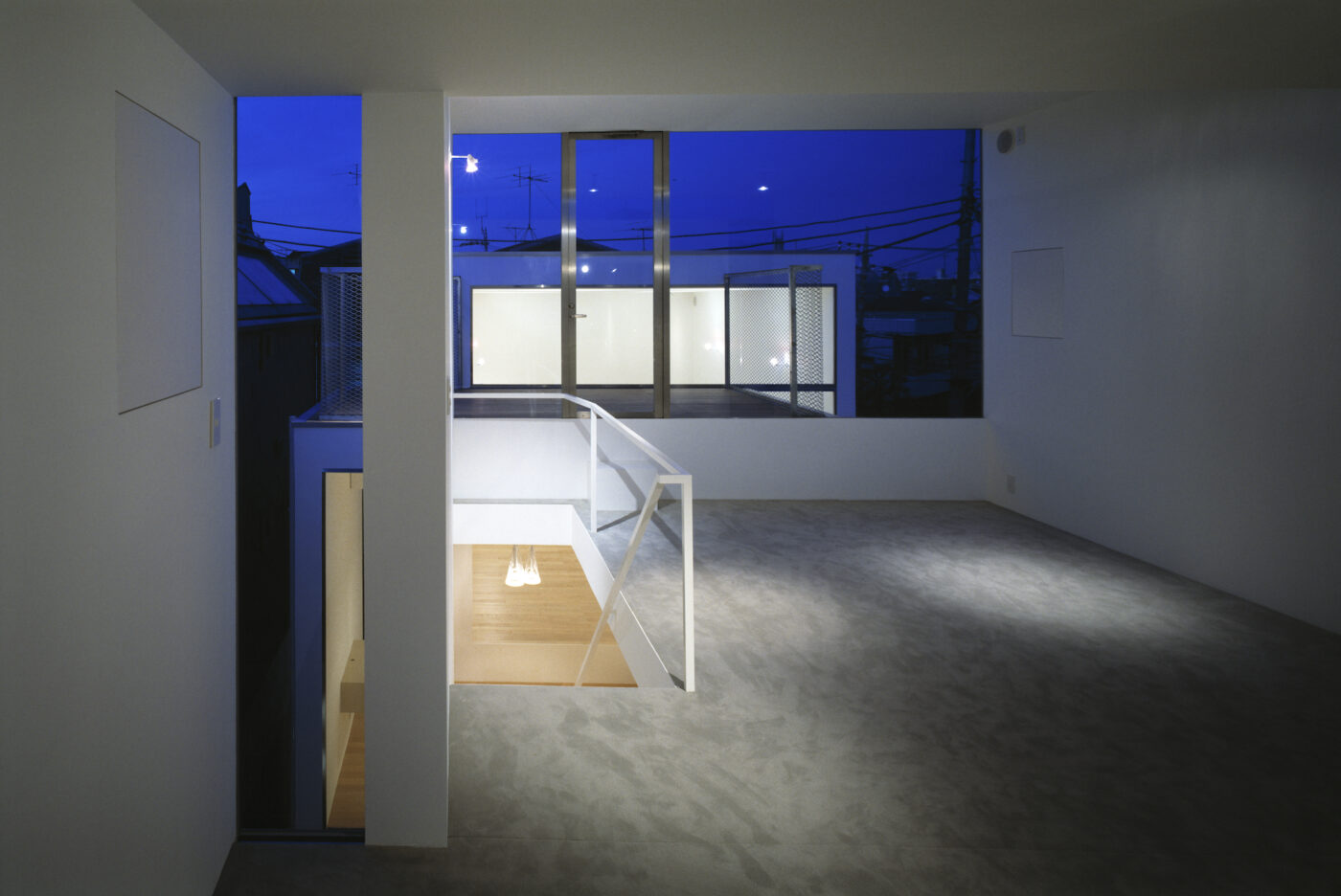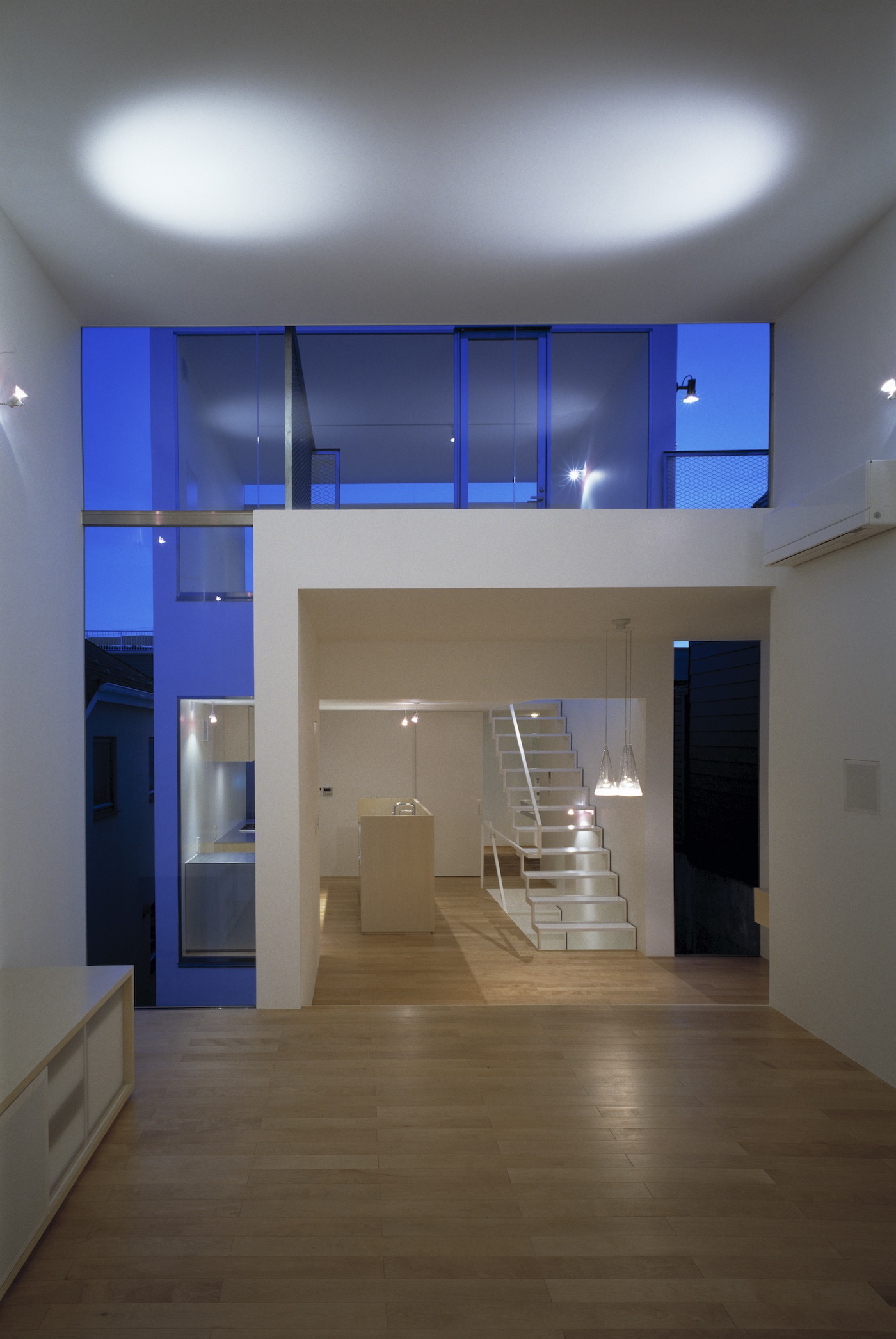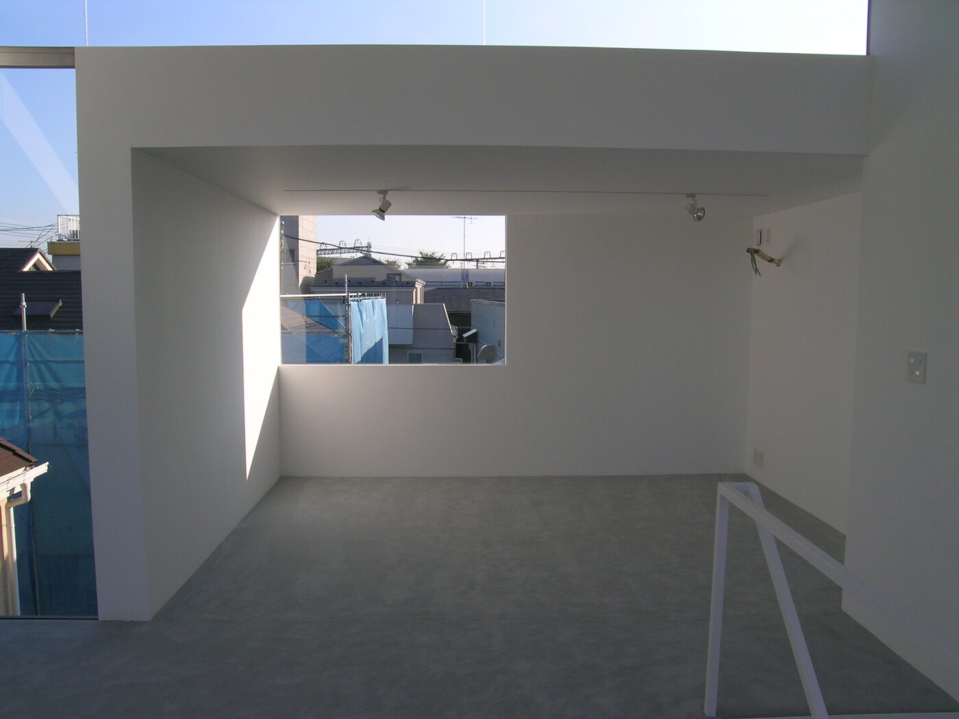 ダイニングから階段を上がって3階へ。門型ボリュームがつくるL字型の隙間が青空を切り取る。