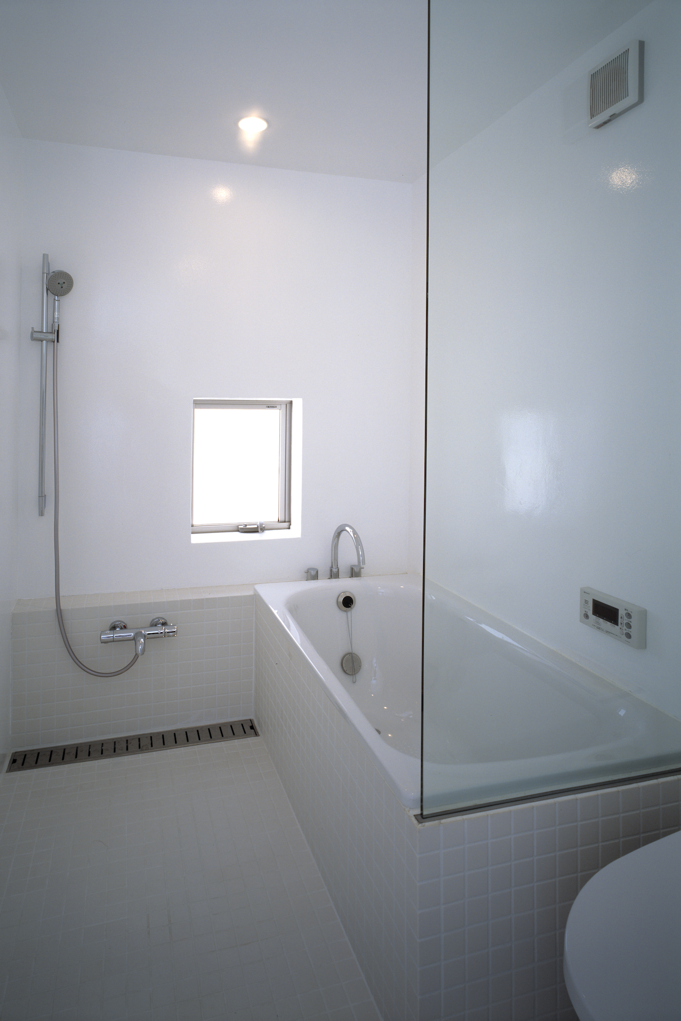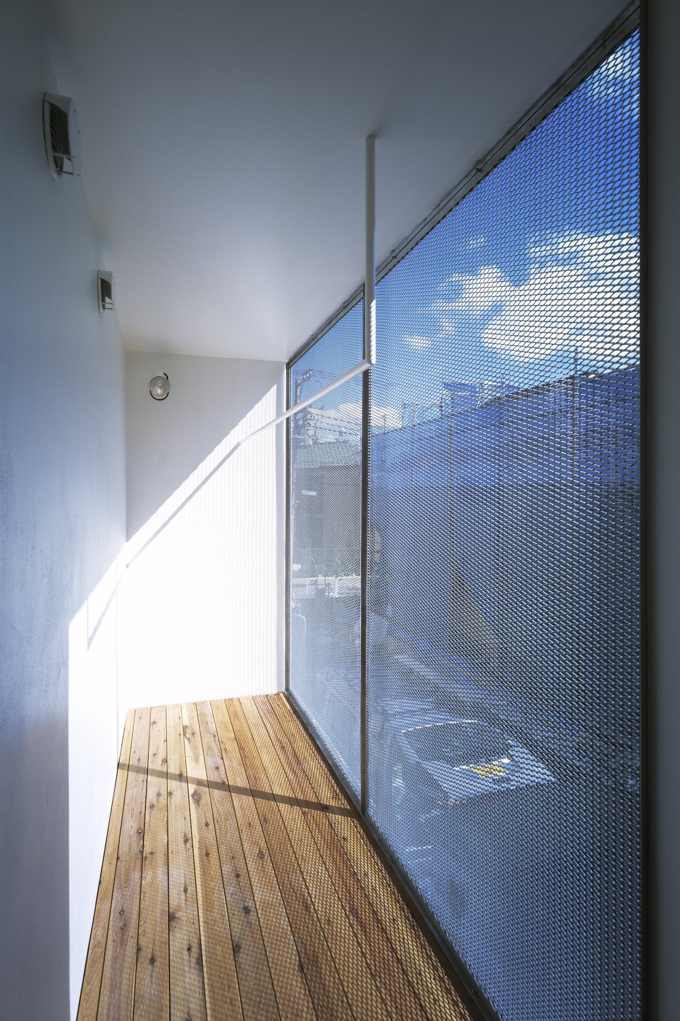 ご夫婦ともにお忙しいため、家事動線を機能的にすることで時間の効率化をめざした。キッチンに隣接した水回りは、洗面脱衣室と浴室、物干しスペースがコンパクトに収まっている。物干しスペースは敷地の一番南に位置し、外から洗濯物が見えないように、しかし、風は通すように目の細かいエキスパンドメタルをスクリーンとした。