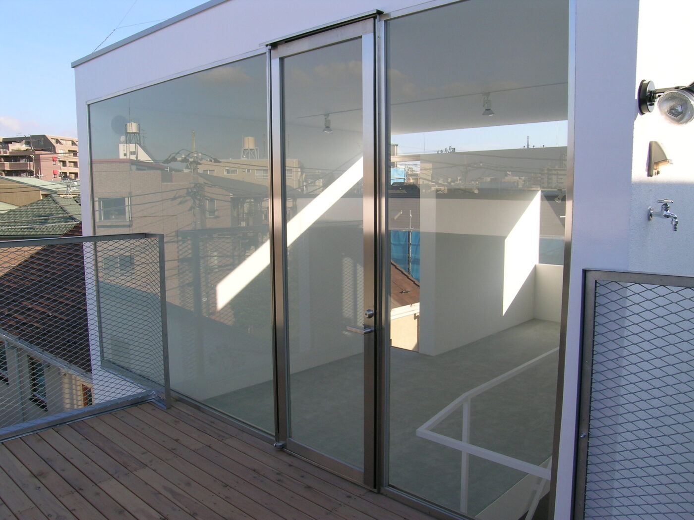 低い2階建てボリュームの上部は、手前と奥の建物に囲まれた屋上テラスとしている。